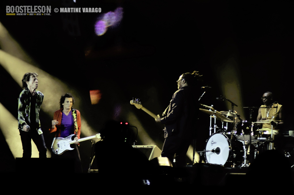 21h15 : Les Stones débarquent sur scène avec un « Street Fighting Man » où déjà Mick Jagger, vêtu d’un pantalon noir et d’une veste rose et orange, virevolte entre les premiers rangs et la batterie. C’est un signe qui montre l’énergie inépuisable ancrée dans les veines de la star.