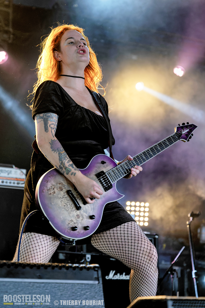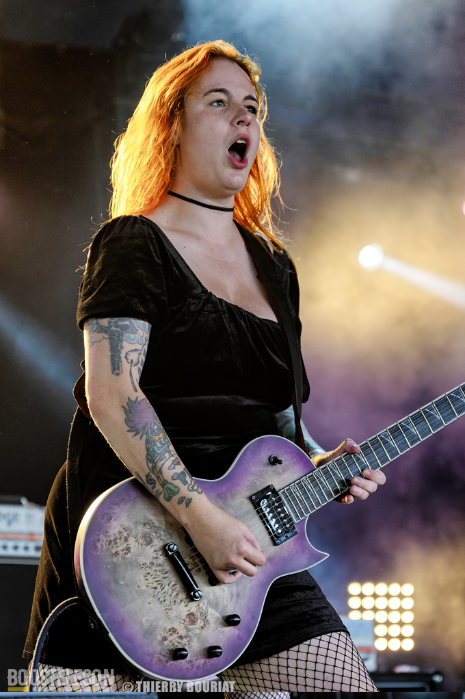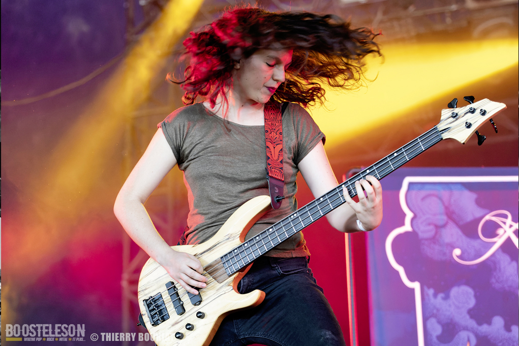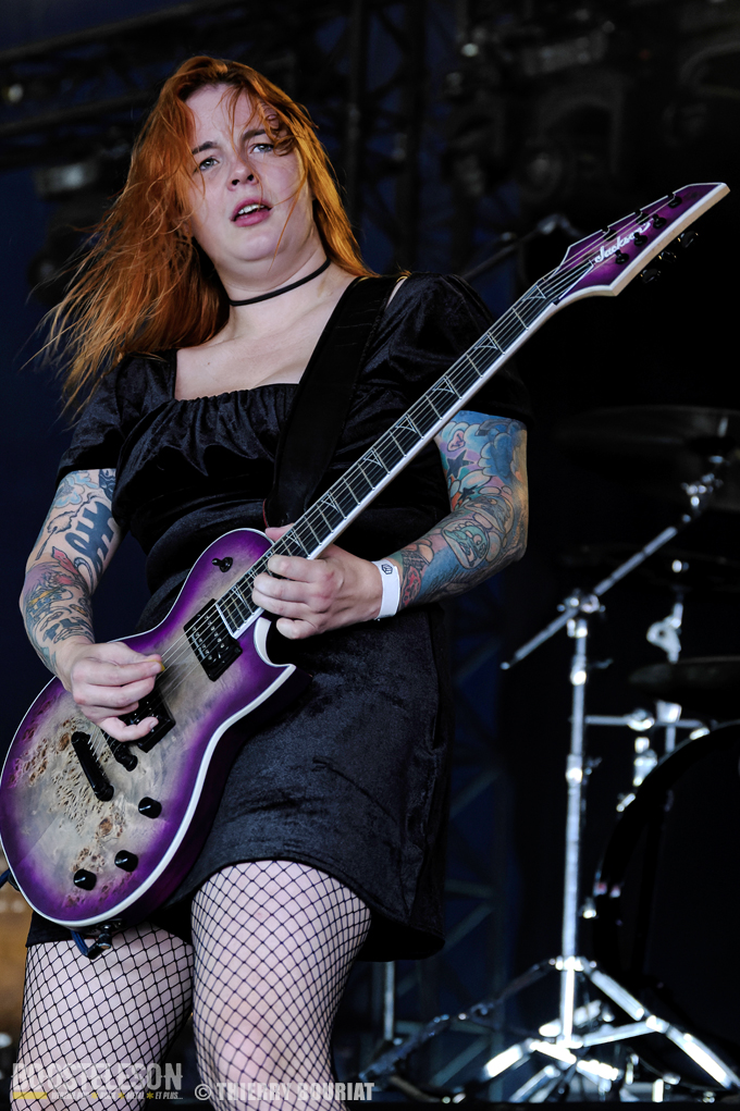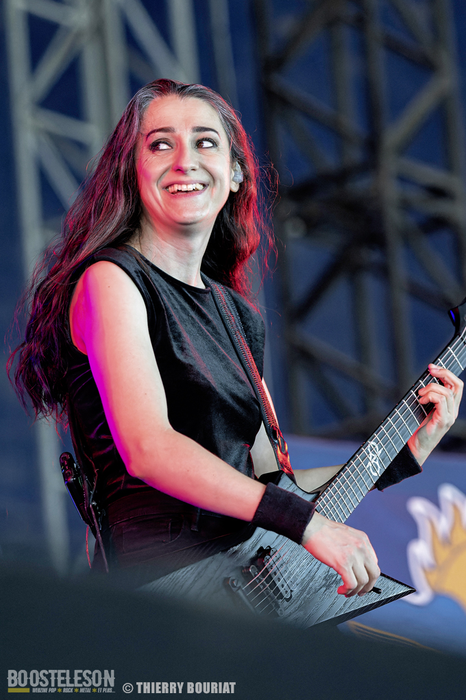 Aephanemer ouvre cette journée du vendredi devant une foule déjà nombreuse massée devant la Dave Mustage. Le quatuor toulousain mené par Marion (chant & guitare rythmique) balance son death metal mélodique et enchaîne les titres comme « Antigone », « Land of Hope », « Le Radeau de La Méduse »,… tirés de leur dernier album « A Dream Of Wilderness » sorti en mars dernier. Le couple basse (Lucie)/ batterie (Mickäel) assure une assise rythmique bien en place pendant que Sylvestre (qui remplaçait Martin sur quelques dates) multipliait les soli techniques. Le set est bien maîtrisé, c’est pro et l’on peut voir la complicité des membres sur scène et leur joie d’être là.