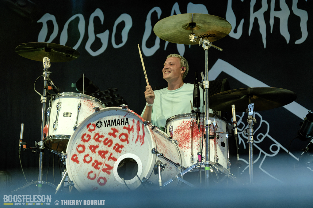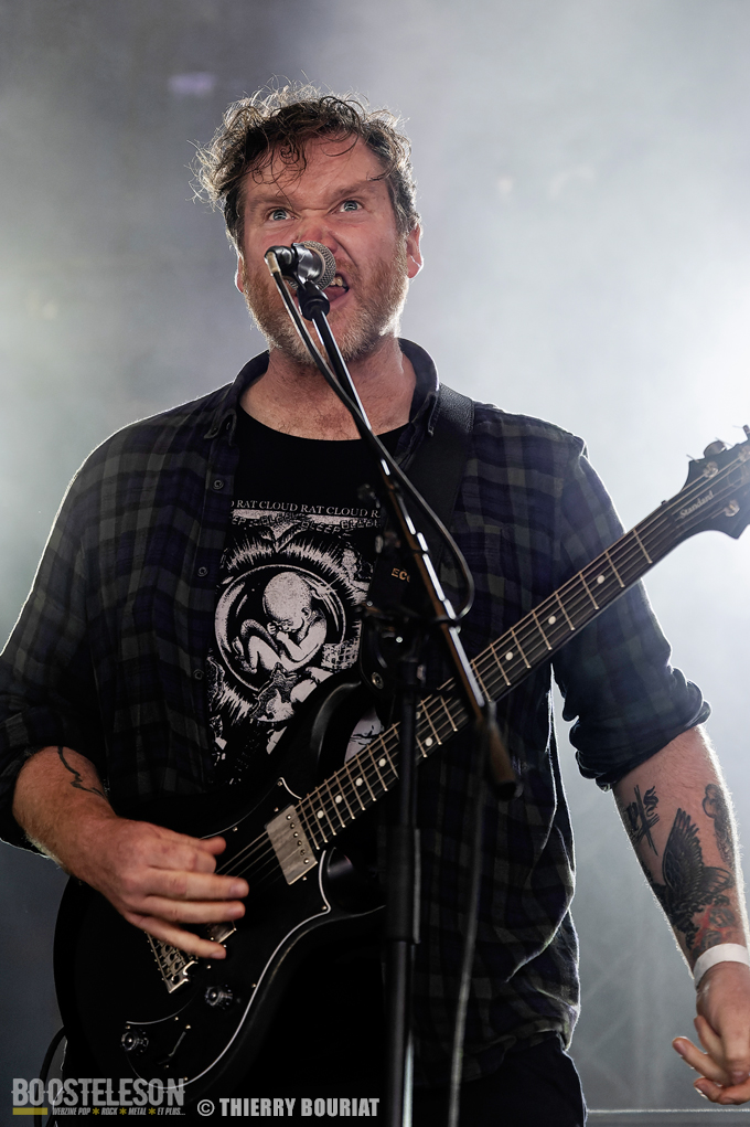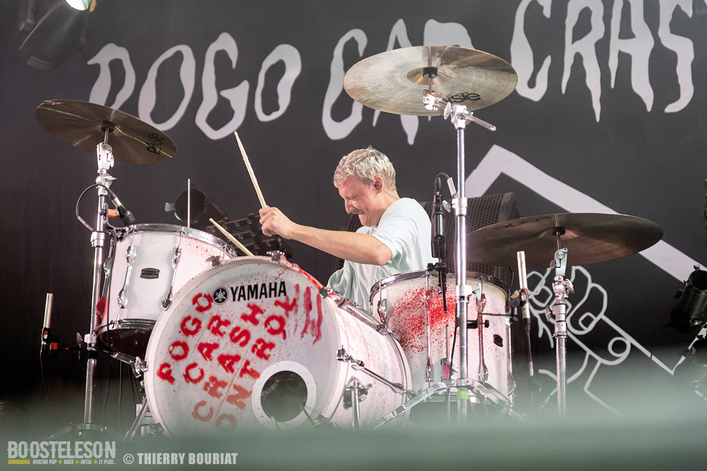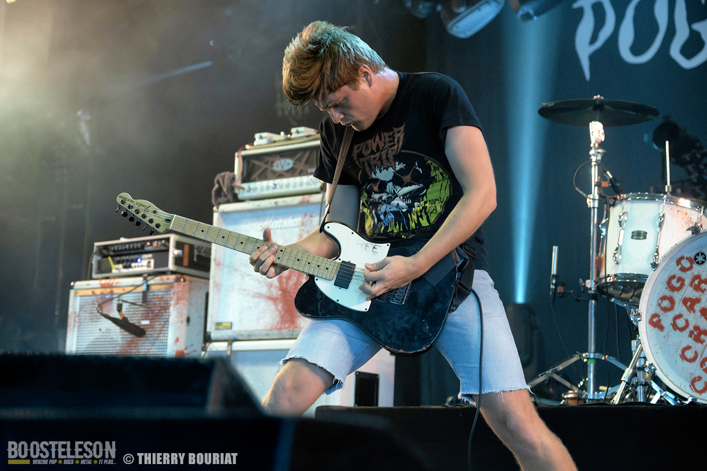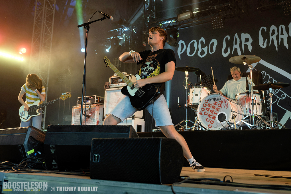 Je voulais découvrir live Pogo Car Crash Control que je ne connaissais que par le biais de YouTube qui me les avait proposés en lecture aléatoire. Et là, la claque… une énergie dévastatrice, ça bouge, ça saute, on en prend plein la gueule, les refrains sont accrocheurs. « Aluminium » titre tiré du dernier album « Fréquence Violence » ouvre les hostilités et le public ne se fait pas prié pour enchainer pogos et slams dans la fosse de la Massey. Lola à la basse est explosive, une belle présence scénique tout comme Olivier (chant, guitare), Simon (guitare, chant) et Louis derrière sa Tama maculée de tâches de sang (les amplis Marshall également). Au total 16 titres (dont 8 du dernier album) décapants et un set survitaminé.