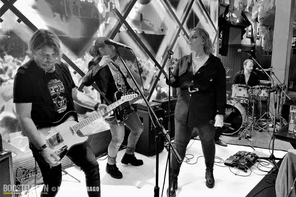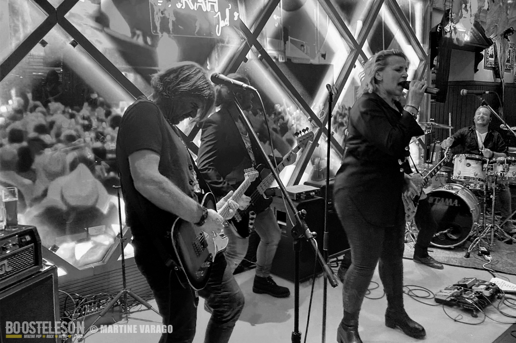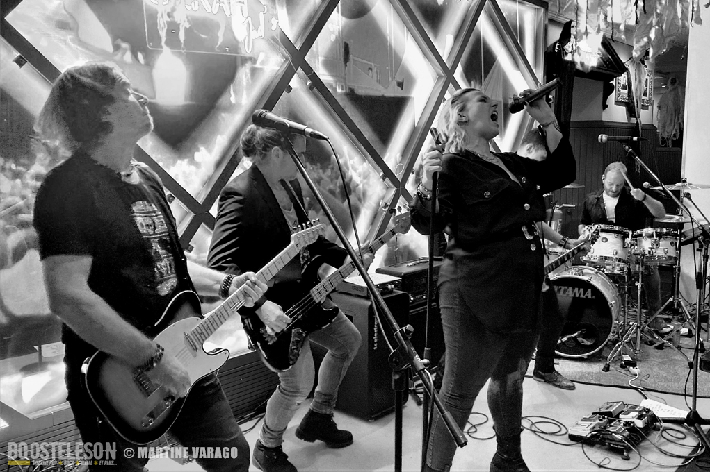 La rockeuse blonde, à la voix mi-Pat Benatar mi-Suzy Quatro, entame son premier set, accompagnée de ses talentueux musiciens au sein du Hard Rock Café parisien. C’est « Born This Way », reprise de Lady Gaga puis « Free », une compo personnelle aux élans pop rock qui amorcent la soirée. Avec leur style rock tantôt grungy, tantôt glam, imprégné d’un timbre vocal de soul, le quintet fait retentir riffs et martèlements de batterie dans le restaurant. David est, par ailleurs, obligé d’installer du papier format A4 pour amortir le bruit !!! (mdr)
