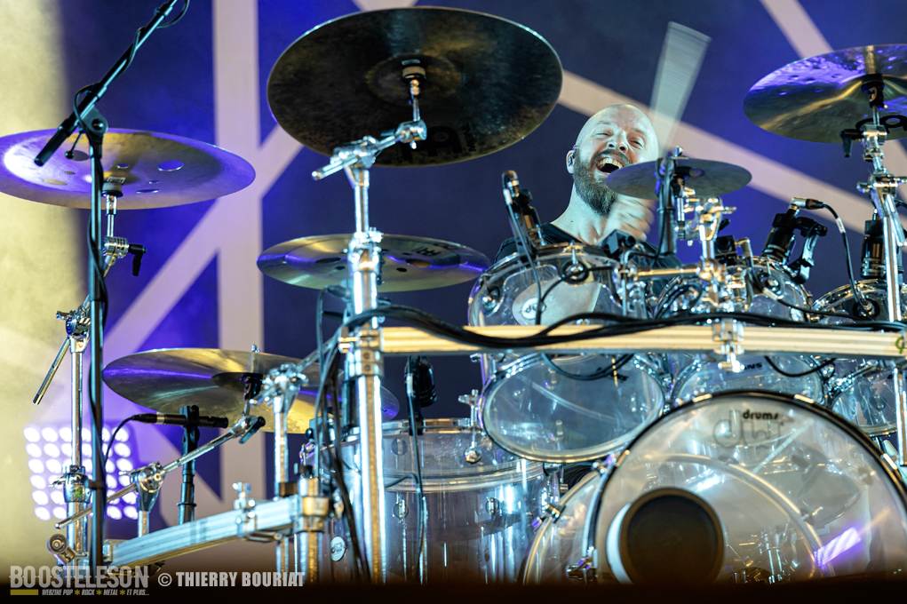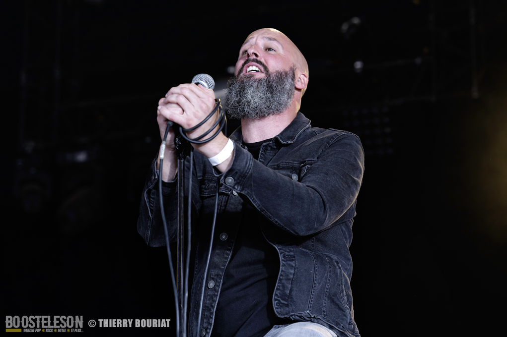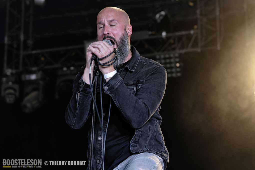 Daniel Tompkins est omniprésent, il ne tient pas en place, comme monté sur ressort il arpente la scène, saute et tel un boxeur frappe l’air de ses poings. Il alterne voix claire, scream avec facilité et sa voix est juste. Ça déboule à 100 à l’heure, avec un gros son de guitares, les rythmes sont agressifs, syncopés, Jay excelle à la double grosse caisse. J’adore ces changements de rythmes, cette folie entrecoupée de moments plus mélodiques, plus doux voire aériens.