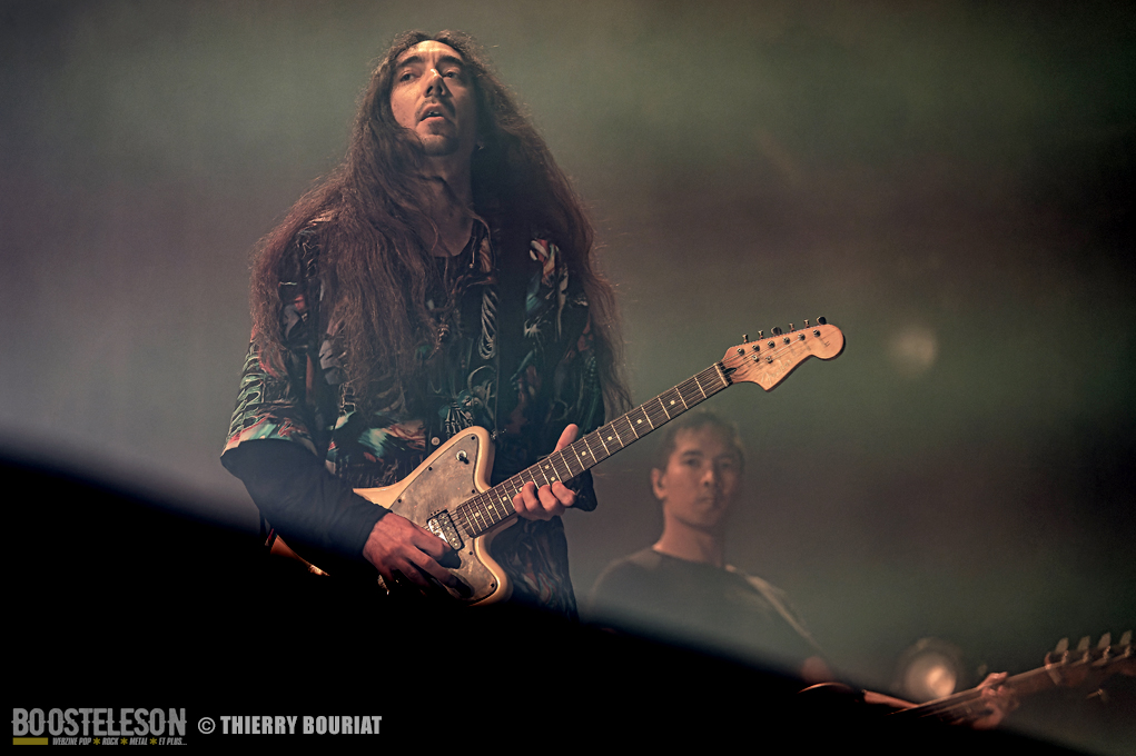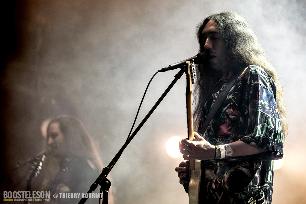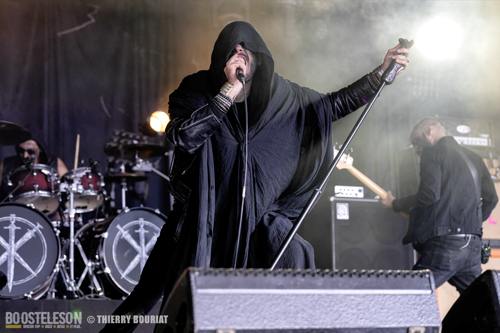 Le chanteur Thomas entame le concert couvert d’une toile ou long foulard noir qui lui couvre les épaules et masque son visage. Il semble « possédé », « envouté » et implorer les Dieux. Son chant est expressif, souvent crié mais avec quelques incursions dans le clair et n’arrête pas de jouer avec son pied de micro.