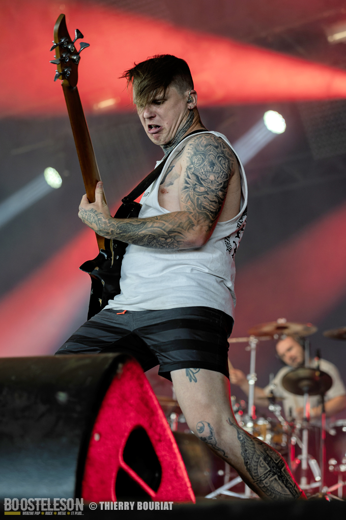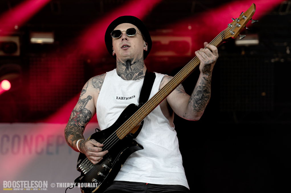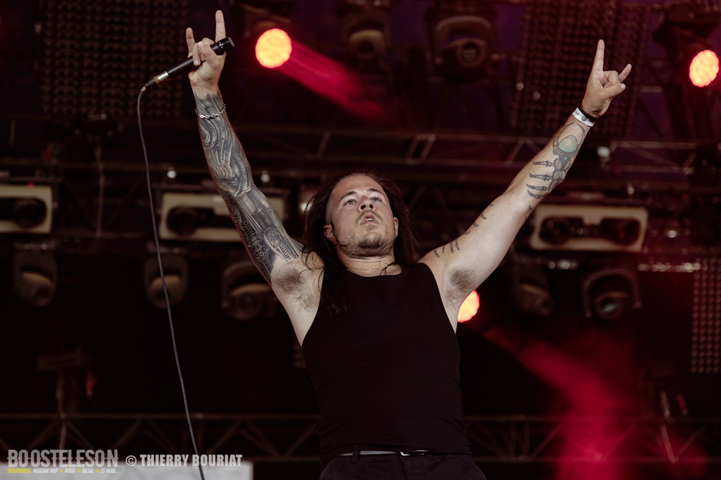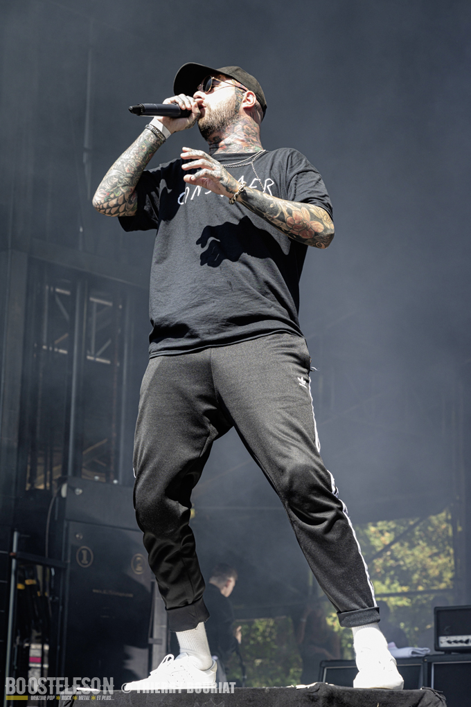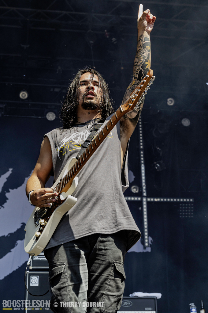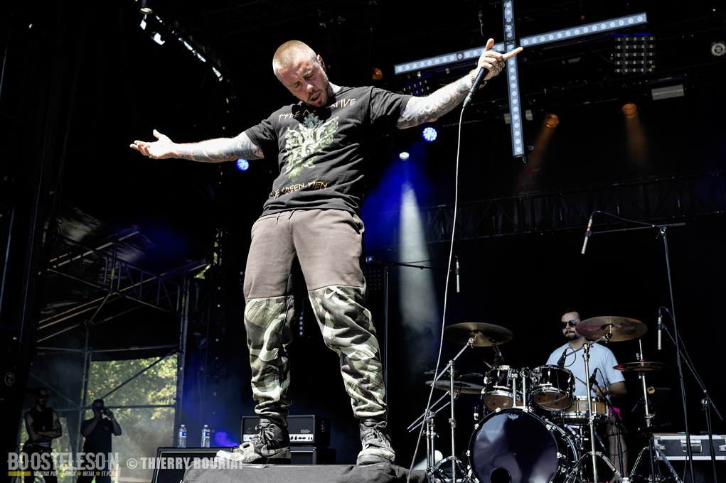 Je file vers la Supositor Stage baignée par la lumière du début d’après-midi pour voir Ten 56 groupe de metalcore/deathcore français, créé à l’été 2020 (qui remplace Lorna Shore ayant annulé), avec Aaron Matts ancien chanteur de Betraying The Martyrs, Luka Garotin (guitare, également membre de Earth Trip), Arnaud Verrier (batterie), Quentin Godet (guitare, membre aussi du groupe Kadinja) et Steeves Hostin (basse, membre de Betraying the Martyrs).