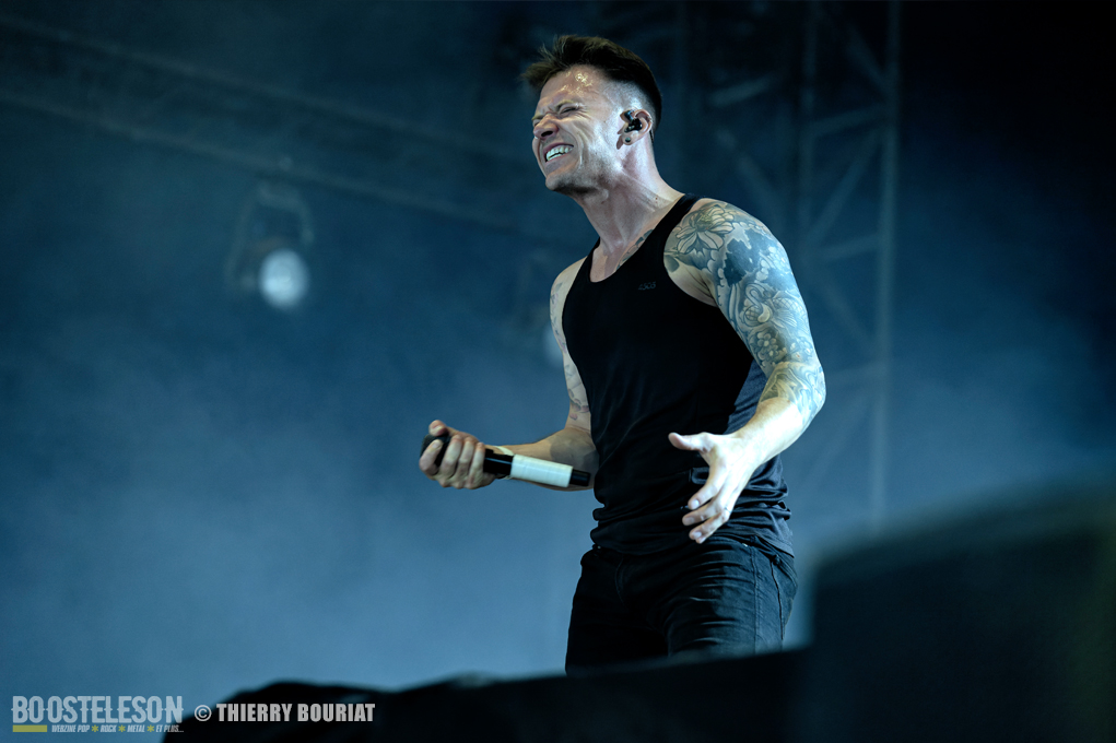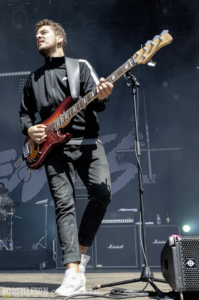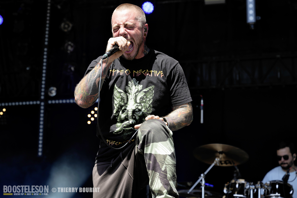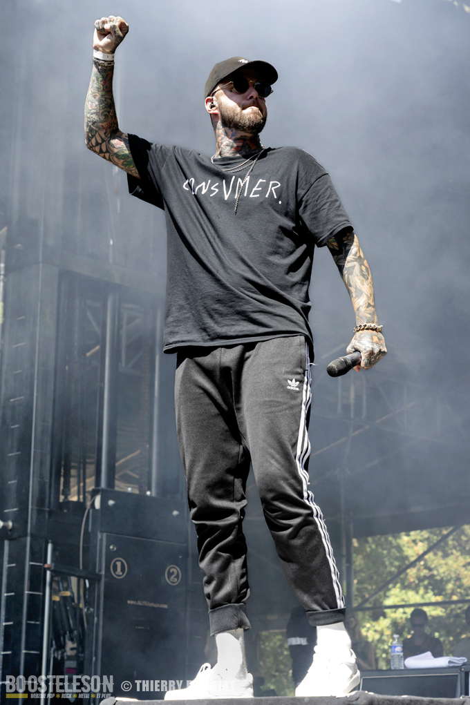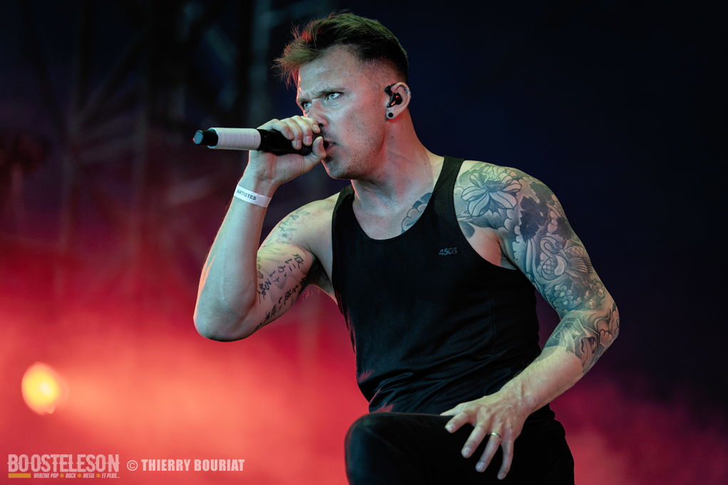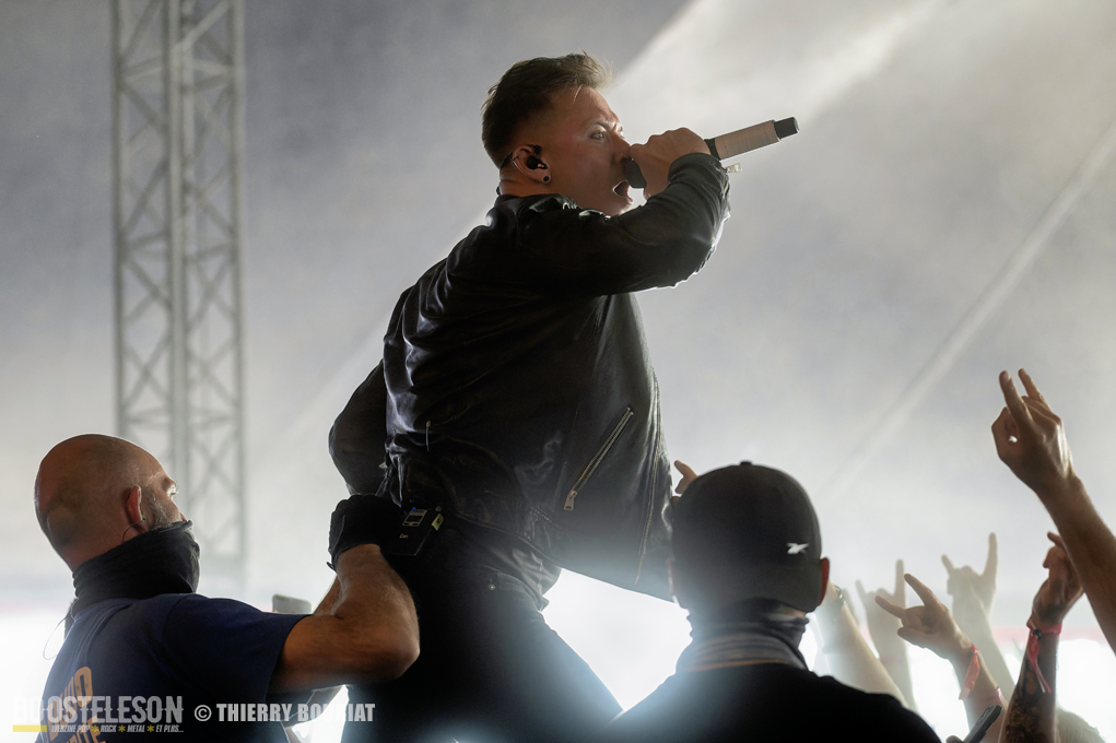 Je file vers la Supositor Stage baignée par la lumière du début d’après-midi pour voir Ten 56 groupe de metalcore/deathcore français, créé à l’été 2020 (qui remplace Lorna Shore ayant annulé), avec Aaron Matts ancien chanteur de Betraying The Martyrs, Luka Garotin (guitare, également membre de Earth Trip), Arnaud Verrier (batterie), Quentin Godet (guitare, membre aussi du groupe Kadinja) et Steeves Hostin (basse, membre de Betraying the Martyrs).