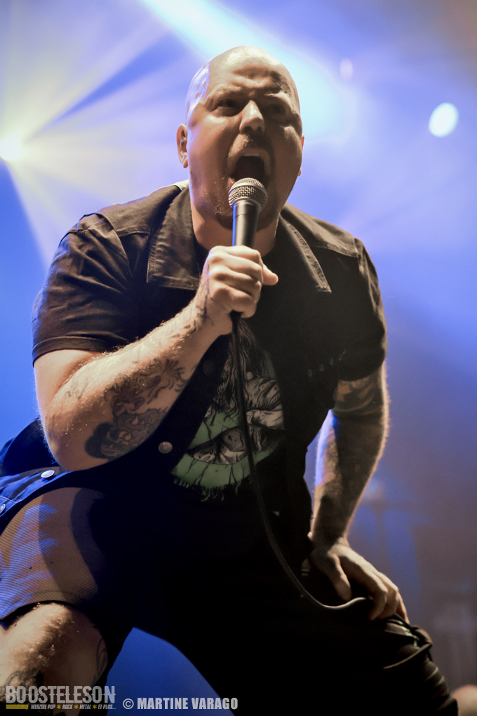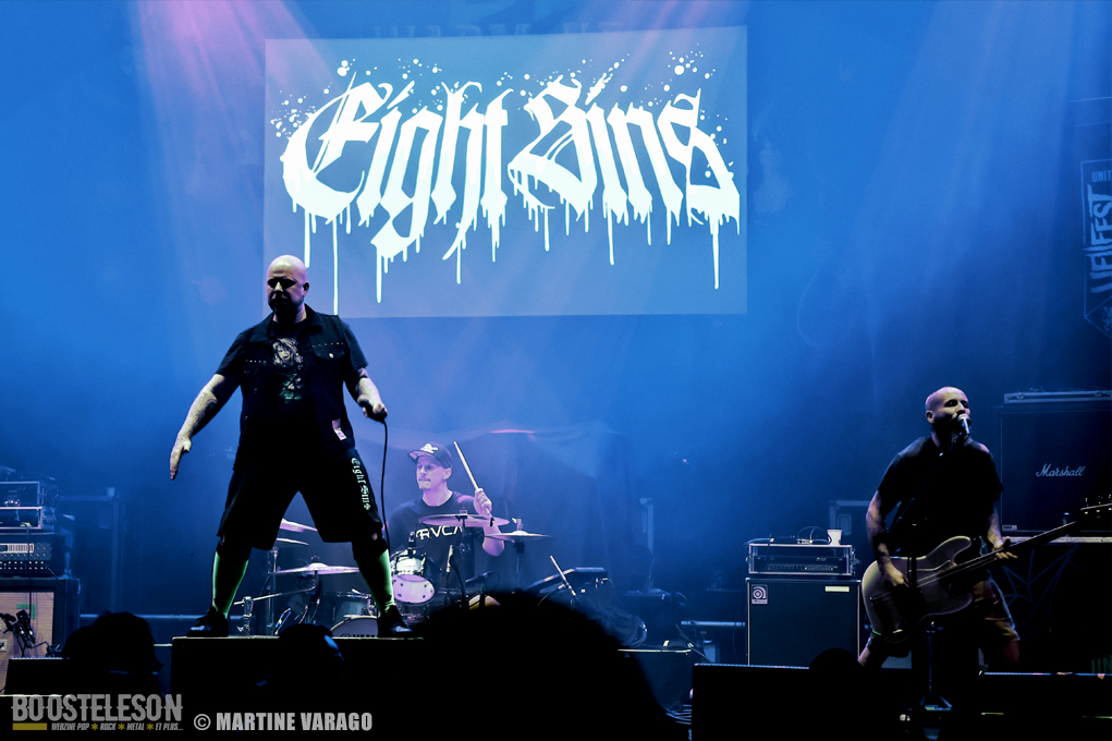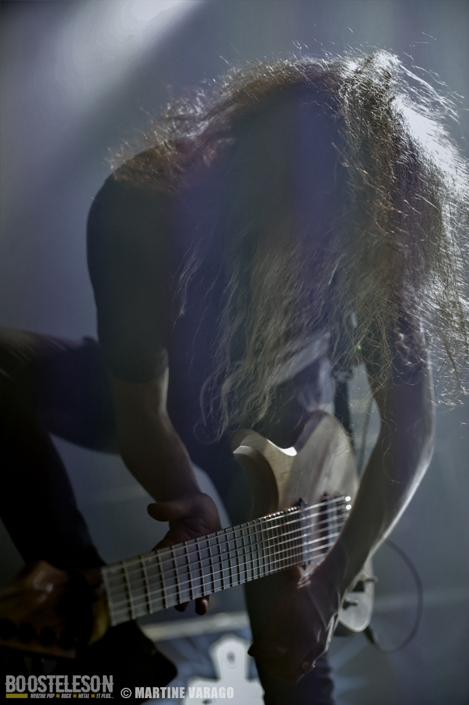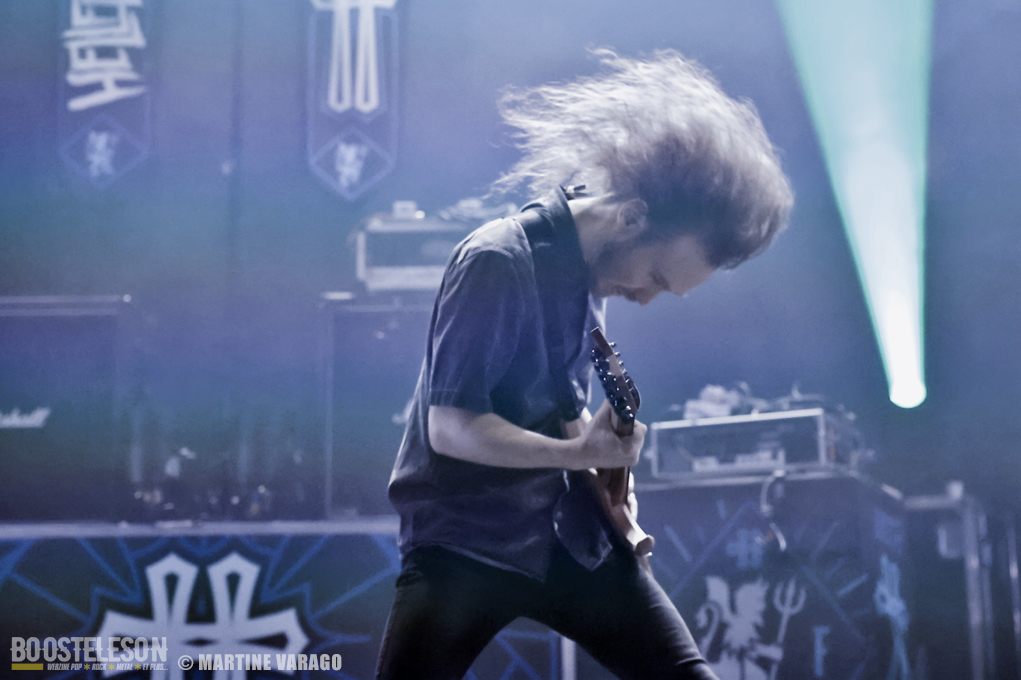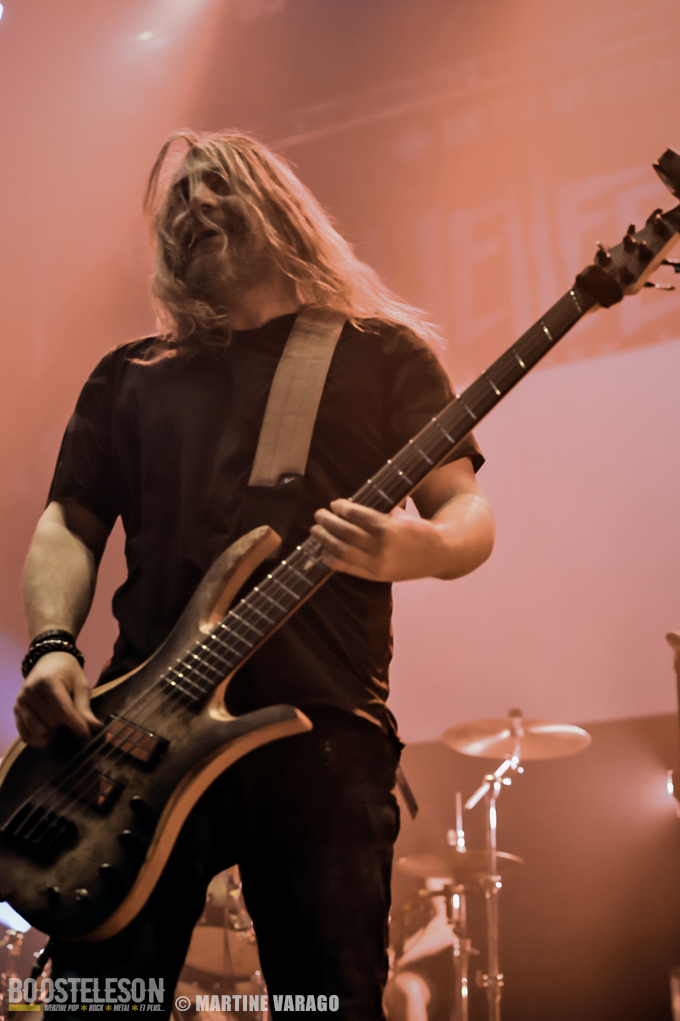 L’ambiance est calme en arrivant à la Coopérative de mai, toute « Hellfestement » décorée pour l’occasion. Beaucoup de monde se retrouve au bar mais quand sonnent 20 heures, EIGHT SINS apparaît, dans la pénombre, sur les planches, après un décompte ritualisé, projeté sur l’arrière de la scène « 59-58…3-2-1-0 ». Les cinq musiciens, originaires de la région de Grenoble, distillent un puissant mélange de hard-core et de metal. Avec une distorsion au micro, Lox chante et invite le public à se mettre debout. Pour en rajouter, il s’adresse avec humour : « J’ai enfilé de longues chaussettes vertes : c’est pour mieux s’échauffer pour le Hellfest ! » et pour mettre de l’ambiance, incite au mosh pit. Entre Arno à la guitare et Mike à la basse, se tient Julien, caché derrière sa batterie. Bien qu’ils ne jouent pas de nouveaux morceaux, ça défile à cent à l’heure et on a le droit à un échantillonnage de leurs trois albums « Straight Eight » (2008), « World of Sorrow » (2013) et de leur dernier « Serpents » (2016). EIGHT SINS, au show intense apprécié du public, a bien allumé cette soirée à la Coopérative.