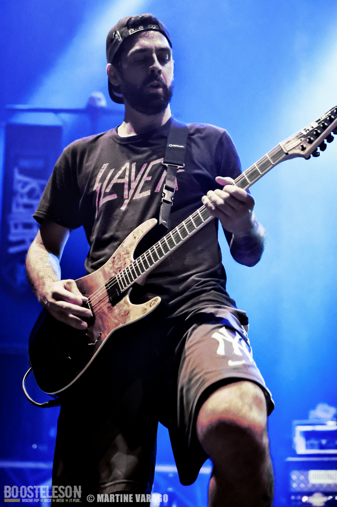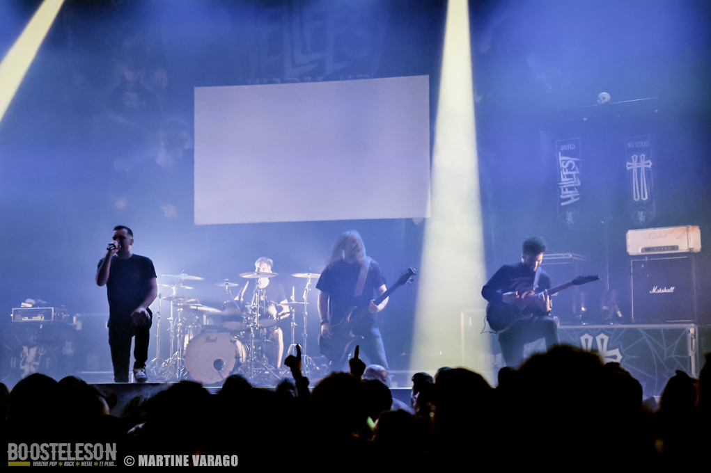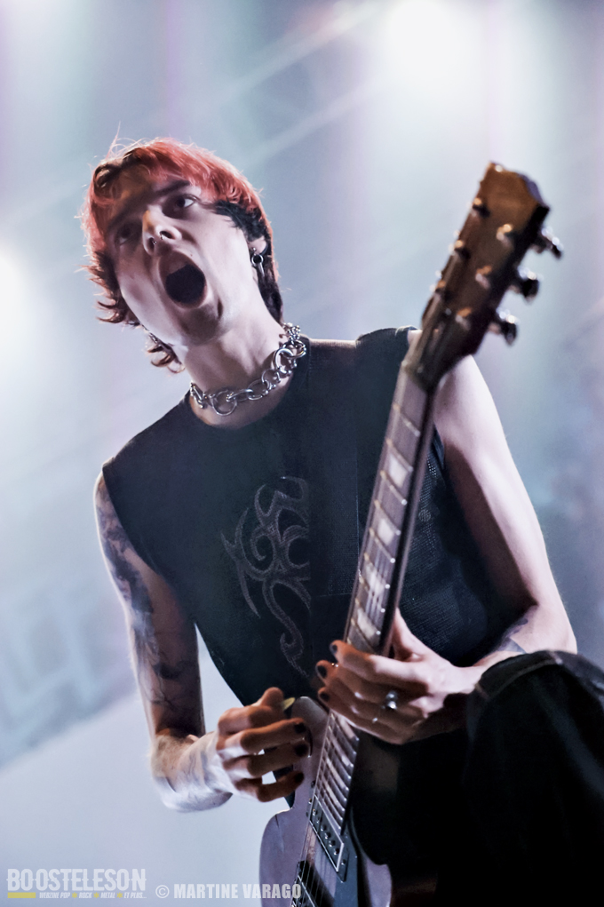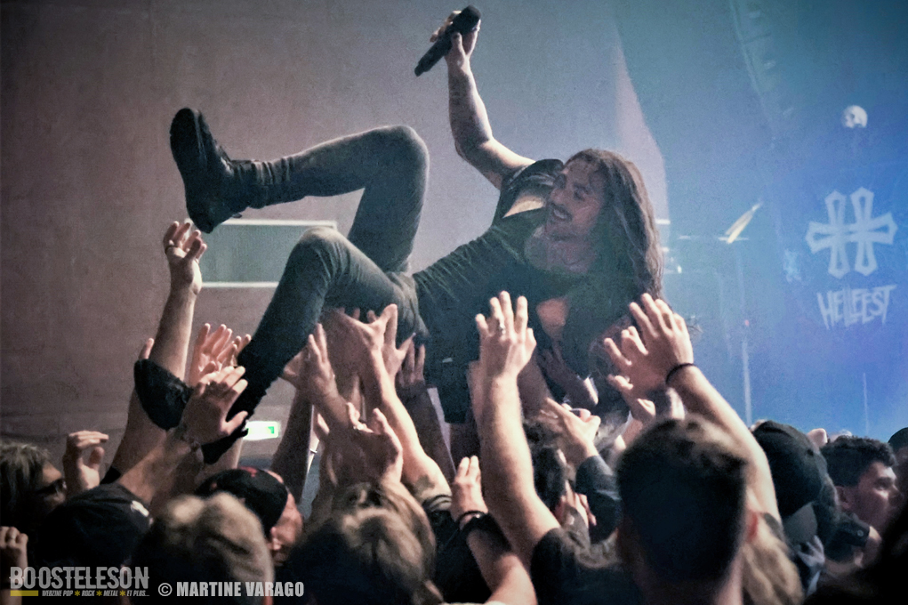 Entre deux représentations, on peut prendre le temps de se faire tatouer, un flash tatoo gratuit du Hellfest. Mais l’obscurité revient vite avant que ne soient lancés un film souvenir du Hellfest 2022 et le décompte minute. Cette introduction permet d’éveiller la salle avant que ne débarquent les six membres composant BETRAYING THE MARTYRS. Le chanteur Rui Martins étant absent pour des raisons personnelles, il a la chance de pouvoir être remplacé par Julien Lebon du groupe Atlantic Chronicles. Ce changement de line-up ne perturbe en rien le spectacle tant Julien se donne à fond. Les deux guitaristes, Steeves Hostin et Baptiste Vigier, balancent leurs riffs metal, accompagnés d’une rythmique lourde tenue par le batteur Boris le Gal et le bassiste Valentin Hauser. Victor Guillet, l’un des membres fondateurs de BTM, au clavier, parfois pianote calmement dans la pénombre, parfois se déchaîne comme un fou furieux sur le morceau « Mirror », l’un des plus lourd de l’EP « Silver Lining » sorti en juin 2022. Le groupe déverse son metalcore pendant une quarantaine de minutes, nous rappelant leurs influences de Gojira, Suicide Silence et Cannibal Corpse pour n’en citer que quelques-unes. Ils savent y faire pour enflammer la fosse, qui, à son tour, se lance dans un wall of death suivi d’un circle pit. Le plus extraverti du groupe reste Victor qui s’octroie un stage diving bien maîtrisé et clame : « Clermont-Ferrand, vous êtes les meilleurs ce soir ! »