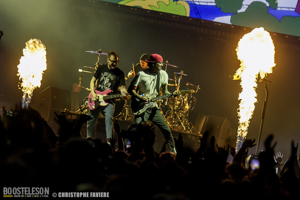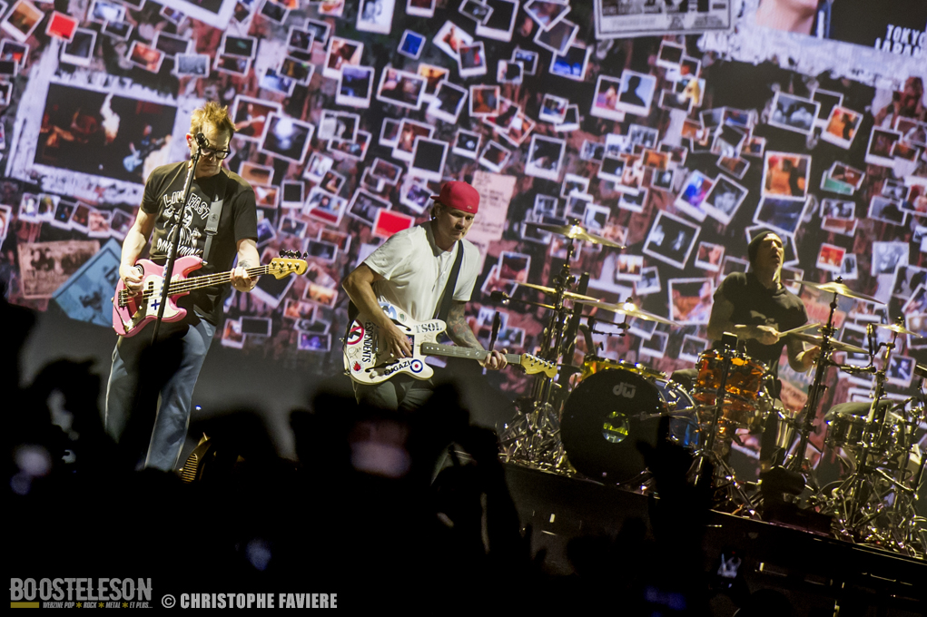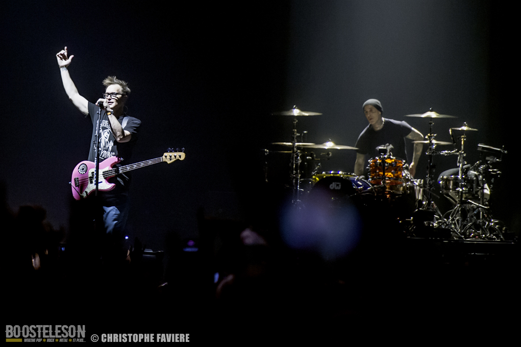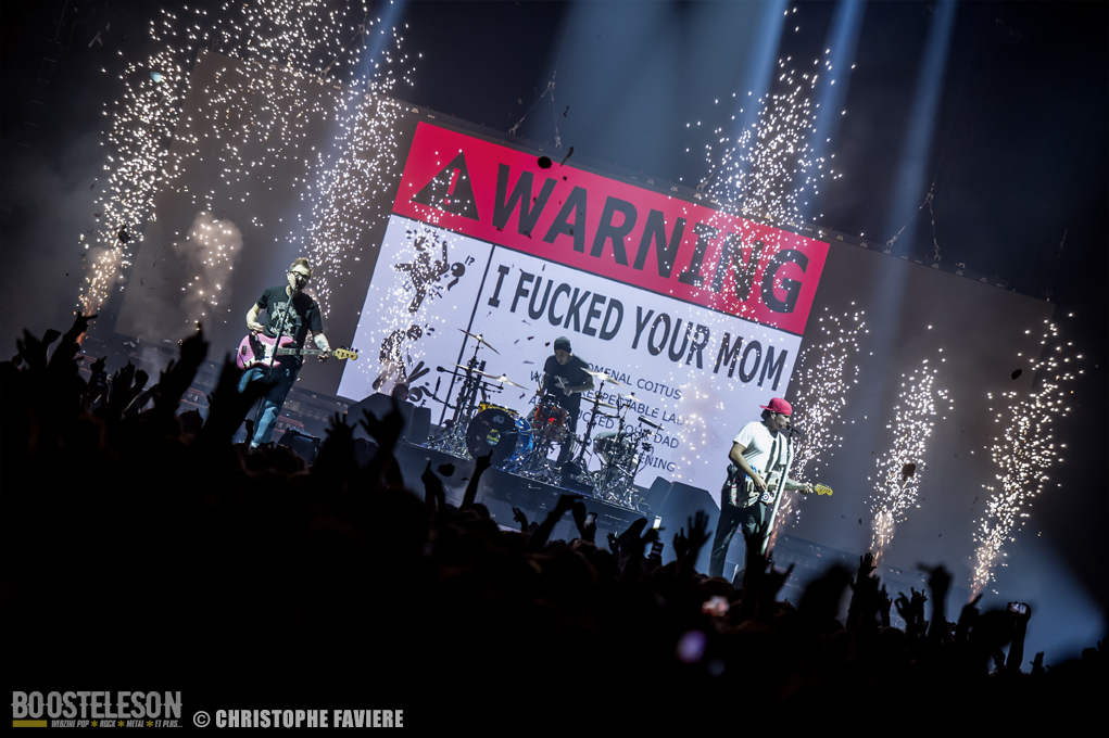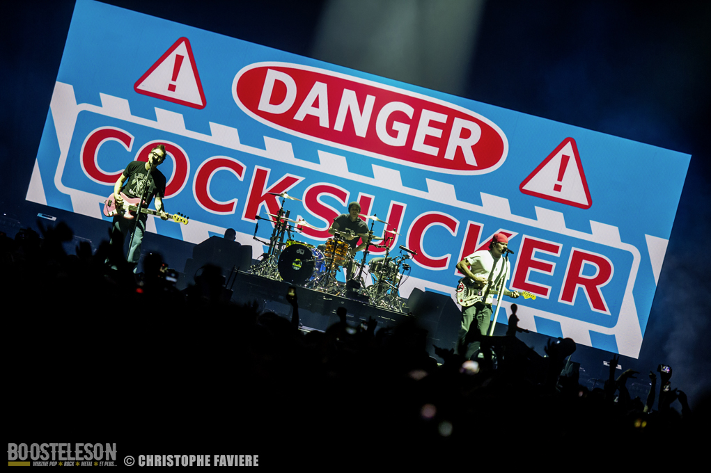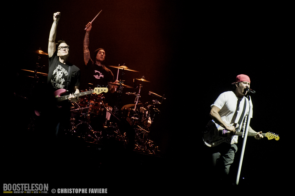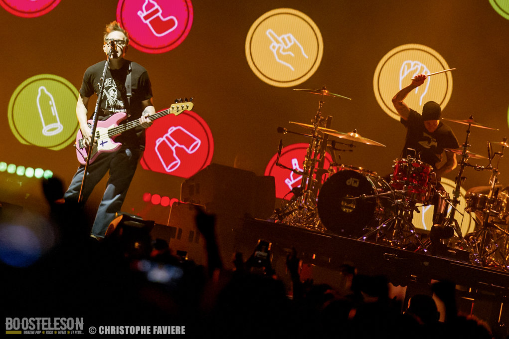 Et c’est pied au plancher que le trio attaque ce concert en enchaînant les quatre premiers titres avant de saluer un public survolté. Le moins qu’on puisse dire, c’est qu’ils appliquent à la lettre les codes du punk, urgence, énergie et morceaux courts (27 titres seront joués ce soir !). Tom DeLonge et Mark Hoppus arpentent la scène en chantant chacun leur tour, alors que Travis Barker martèle ses fûts avec ses grands mouvements de bras donnant l’impression d’avoir une pieuvre derrière la batterie. Travis exécutera le titre « Violence » les yeux bandés, et « Happy Holidays, You Bastard » sera joué lumières éteintes avec seulement la pyrotechnie pour se repérer. Mais ce n’est pas au goût de Tom qui estime que c’est trop lent. Il exige donc que le titre soit rejoué plus vite en traitant ses camarades de « vilains chiens » ! Pour « Stay Together for the Kids », ce sont les téléphones de l’assistance qui serviront d’unique éclairage, magique ! Les tubes s’enchaînent, les slams et les moshpits aussi. La superbe scène en losange permet au groupe de faire profiter de la fête au public sur les côtés. Les lights sont somptueux et l’écran géant diffuse des images dans l’esprit du groupe, à savoir principalement le sexe, le fun et les blagues graveleuses. Bref, vous l’aurez compris, voir Blink 182 en concert, c’est un peu un retour à l’adolescence et s’imaginer sur un skate à rider sous le soleil de Californie en écoutant… du punk évidemment !
