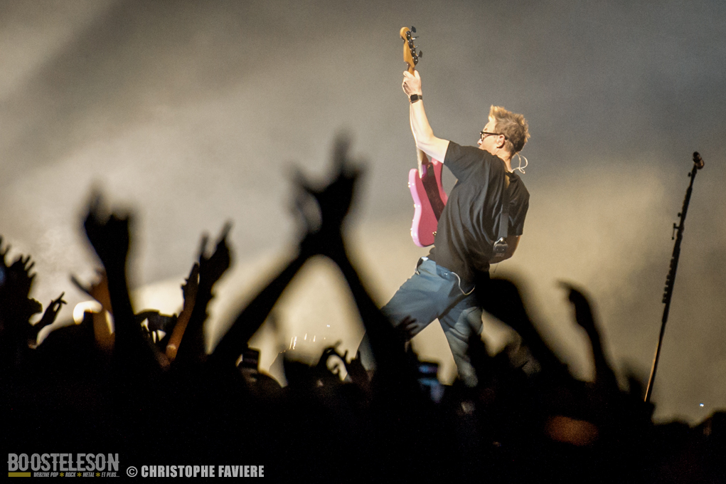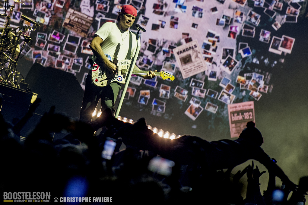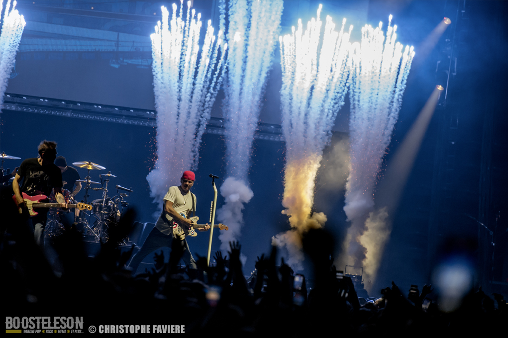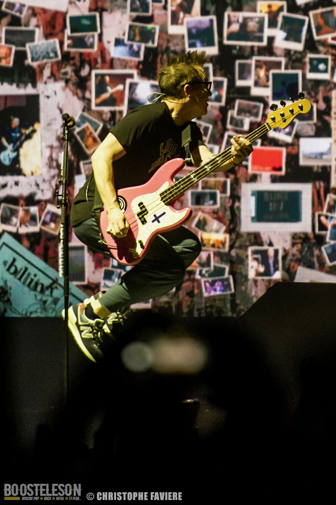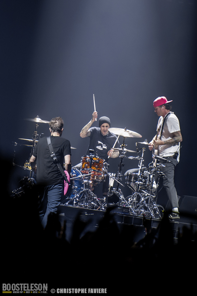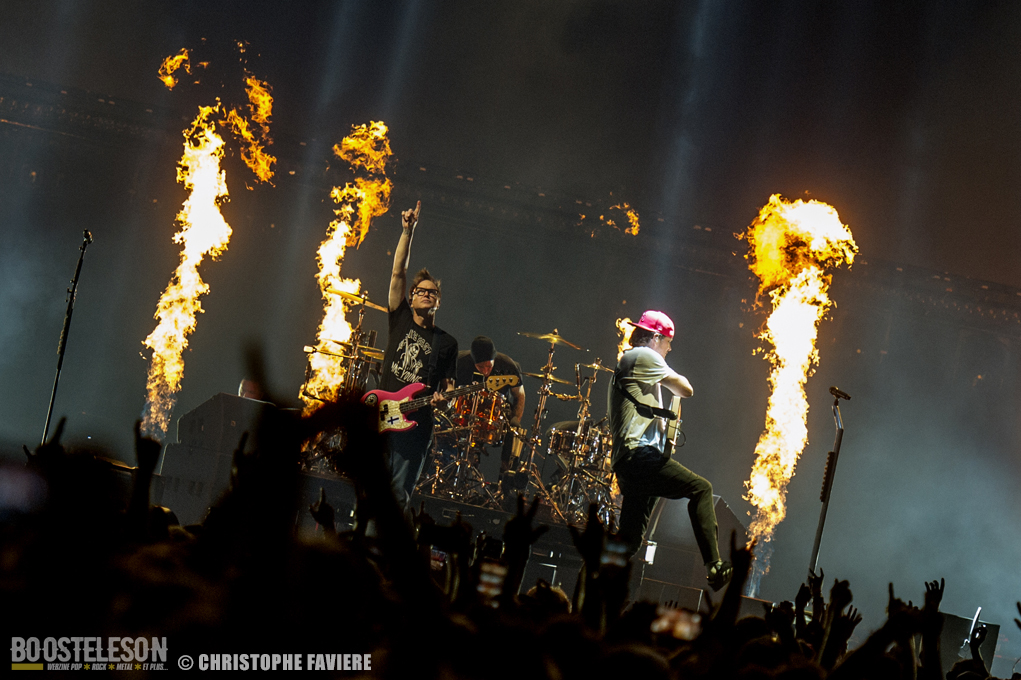 Et c’est pied au plancher que le trio attaque ce concert en enchaînant les quatre premiers titres avant de saluer un public survolté. Le moins qu’on puisse dire, c’est qu’ils appliquent à la lettre les codes du punk, urgence, énergie et morceaux courts (27 titres seront joués ce soir !). Tom DeLonge et Mark Hoppus arpentent la scène en chantant chacun leur tour, alors que Travis Barker martèle ses fûts avec ses grands mouvements de bras donnant l’impression d’avoir une pieuvre derrière la batterie. Travis exécutera le titre « Violence » les yeux bandés, et « Happy Holidays, You Bastard » sera joué lumières éteintes avec seulement la pyrotechnie pour se repérer. Mais ce n’est pas au goût de Tom qui estime que c’est trop lent. Il exige donc que le titre soit rejoué plus vite en traitant ses camarades de « vilains chiens » ! Pour « Stay Together for the Kids », ce sont les téléphones de l’assistance qui serviront d’unique éclairage, magique ! Les tubes s’enchaînent, les slams et les moshpits aussi. La superbe scène en losange permet au groupe de faire profiter de la fête au public sur les côtés. Les lights sont somptueux et l’écran géant diffuse des images dans l’esprit du groupe, à savoir principalement le sexe, le fun et les blagues graveleuses. Bref, vous l’aurez compris, voir Blink 182 en concert, c’est un peu un retour à l’adolescence et s’imaginer sur un skate à rider sous le soleil de Californie en écoutant… du punk évidemment !
