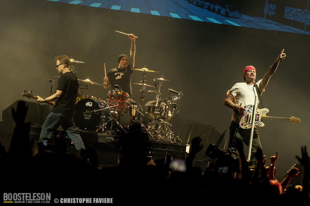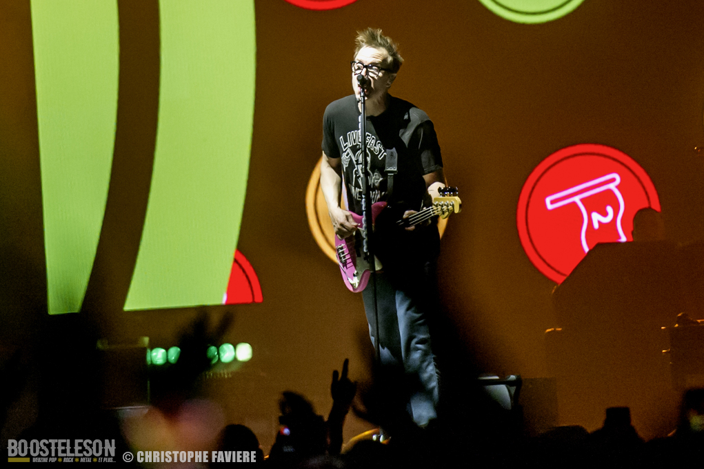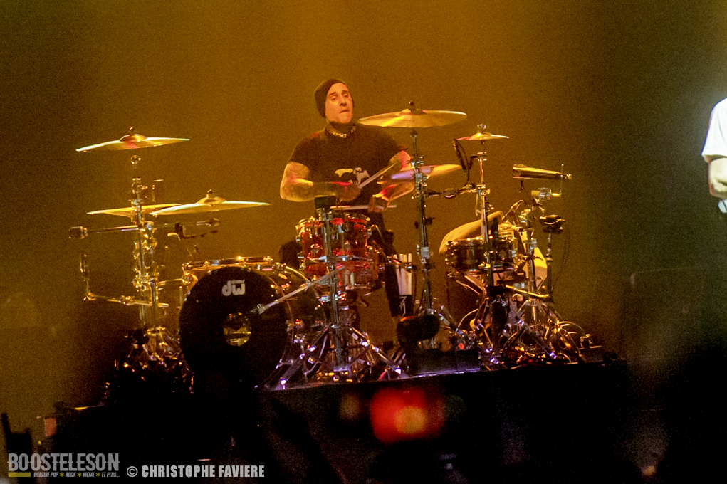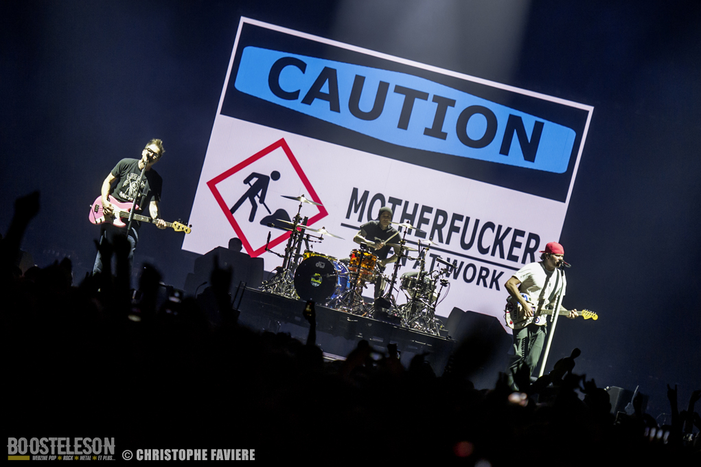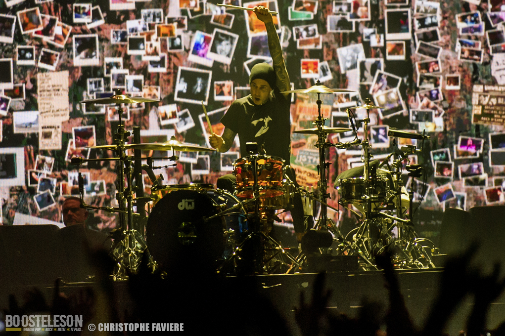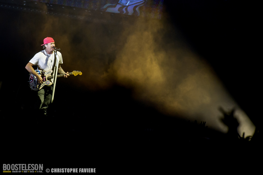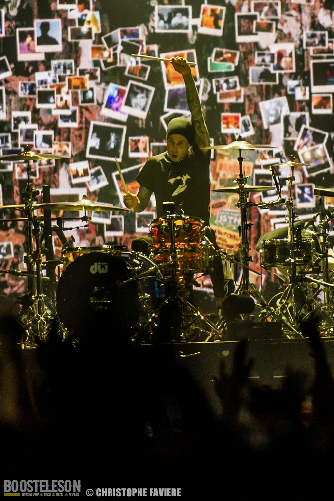 Et c’est pied au plancher que le trio attaque ce concert en enchaînant les quatre premiers titres avant de saluer un public survolté. Le moins qu’on puisse dire, c’est qu’ils appliquent à la lettre les codes du punk, urgence, énergie et morceaux courts (27 titres seront joués ce soir !). Tom DeLonge et Mark Hoppus arpentent la scène en chantant chacun leur tour, alors que Travis Barker martèle ses fûts avec ses grands mouvements de bras donnant l’impression d’avoir une pieuvre derrière la batterie. Travis exécutera le titre « Violence » les yeux bandés, et « Happy Holidays, You Bastard » sera joué lumières éteintes avec seulement la pyrotechnie pour se repérer. Mais ce n’est pas au goût de Tom qui estime que c’est trop lent. Il exige donc que le titre soit rejoué plus vite en traitant ses camarades de « vilains chiens » ! Pour « Stay Together for the Kids », ce sont les téléphones de l’assistance qui serviront d’unique éclairage, magique ! Les tubes s’enchaînent, les slams et les moshpits aussi. La superbe scène en losange permet au groupe de faire profiter de la fête au public sur les côtés. Les lights sont somptueux et l’écran géant diffuse des images dans l’esprit du groupe, à savoir principalement le sexe, le fun et les blagues graveleuses. Bref, vous l’aurez compris, voir Blink 182 en concert, c’est un peu un retour à l’adolescence et s’imaginer sur un skate à rider sous le soleil de Californie en écoutant… du punk évidemment !