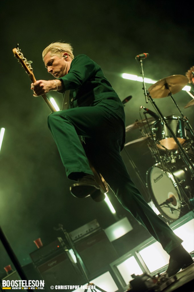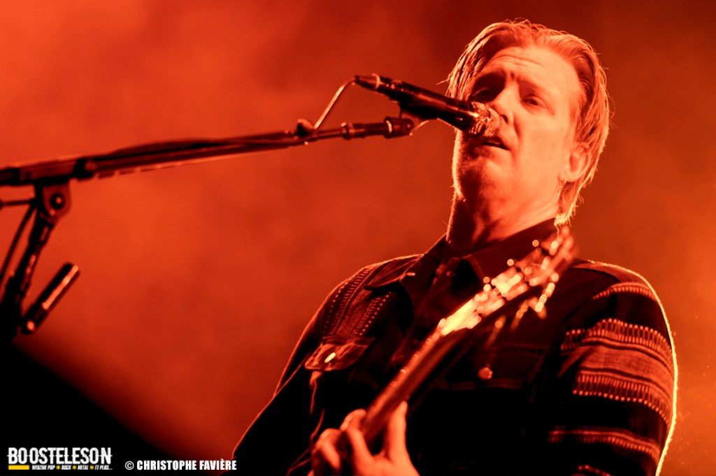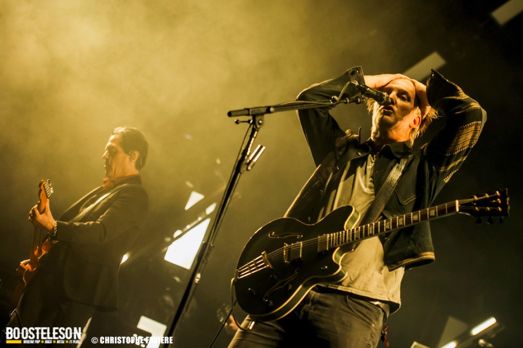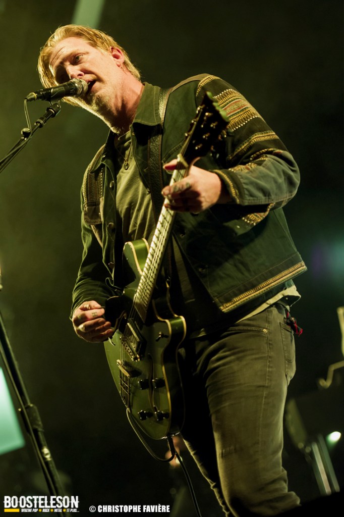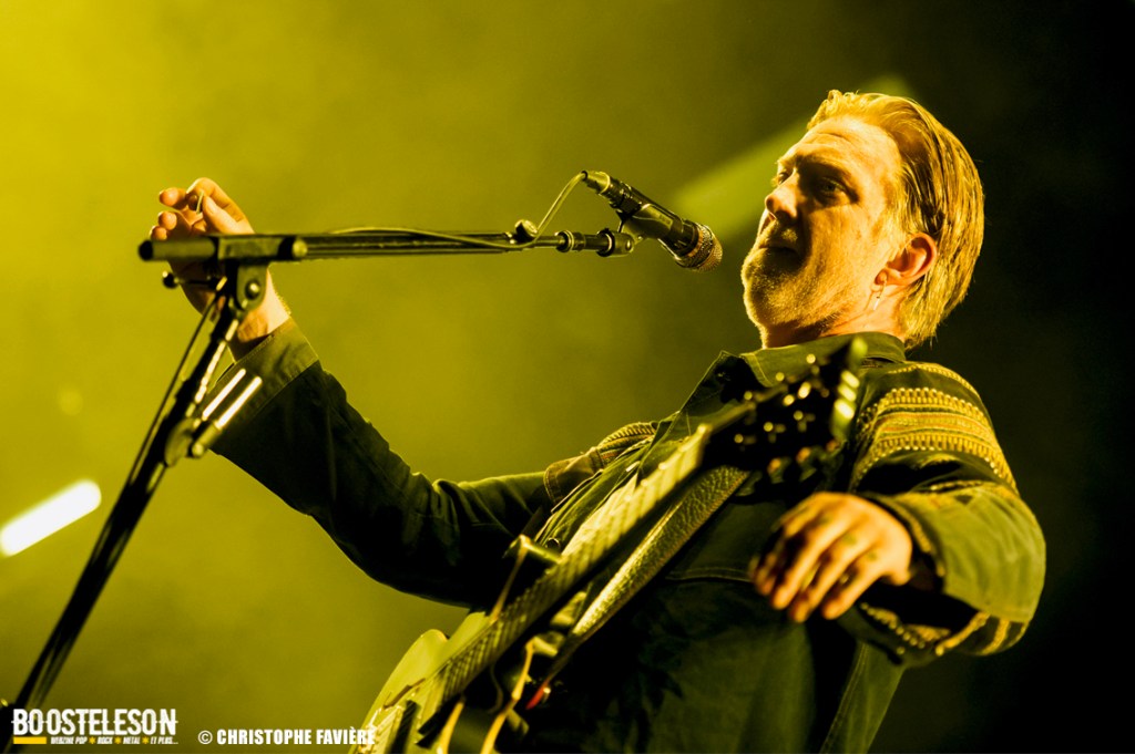 Les titres s’enchainent avec une énergie ne décroissant pas un seul instant. Josh Homme s’adresse au public comme à des potes, assurant que Paris est une de leur ville préférée au monde. Troy Van Leeuwen, costume impeccable, cheveux gominés, bouge tel un Dandi Rock, malmenant ses guitares et leur tirant des sons distordus à sa guise comme sur l’hypnotisant « Better Living Through The Chemistry ». Issu du dernier album, « Negative Space » ramènera tout le monde dans une zone plus rock avant que, clope au bec, Josh n’entame une version légèrement déstructurée de « Make It With Chu » et ne se lance dans un solo semblant improvisé et débouchant sur le « Miss You » des Rolling Stones avant de revenir à la chanson avec son refrain repris en chœur par le public et un Accor Arena éclairé par des milliers de téléphones. Épic ! « Little Sister » conclura la première partie du concert avant que le groupe ne revienne pour un rappel Dantesque.