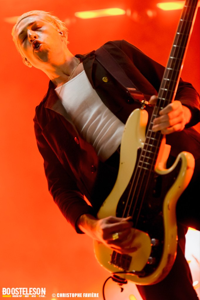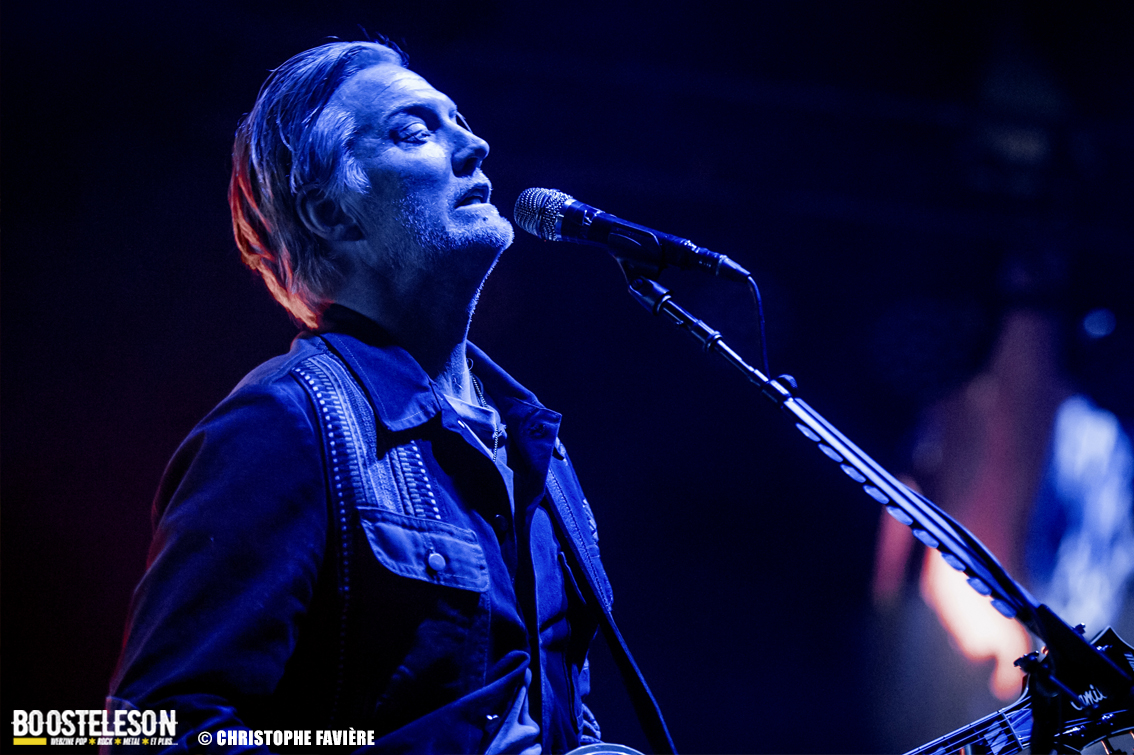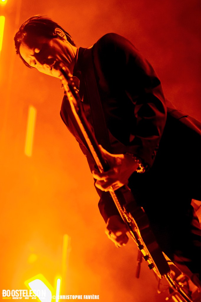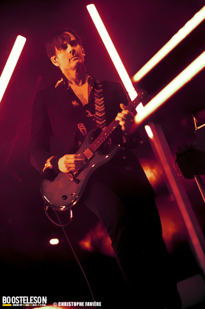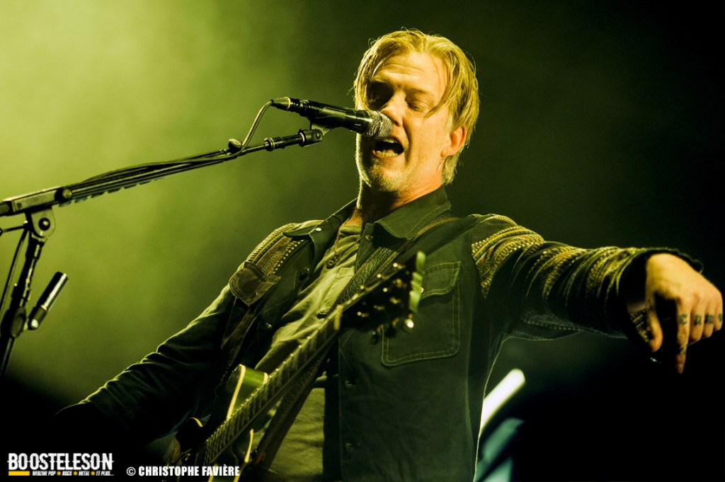 Les titres s’enchainent avec une énergie ne décroissant pas un seul instant. Josh Homme s’adresse au public comme à des potes, assurant que Paris est une de leur ville préférée au monde. Troy Van Leeuwen, costume impeccable, cheveux gominés, bouge tel un Dandi Rock, malmenant ses guitares et leur tirant des sons distordus à sa guise comme sur l’hypnotisant « Better Living Through The Chemistry ». Issu du dernier album, « Negative Space » ramènera tout le monde dans une zone plus rock avant que, clope au bec, Josh n’entame une version légèrement déstructurée de « Make It With Chu » et ne se lance dans un solo semblant improvisé et débouchant sur le « Miss You » des Rolling Stones avant de revenir à la chanson avec son refrain repris en chœur par le public et un Accor Arena éclairé par des milliers de téléphones. Épic ! « Little Sister » conclura la première partie du concert avant que le groupe ne revienne pour un rappel Dantesque.