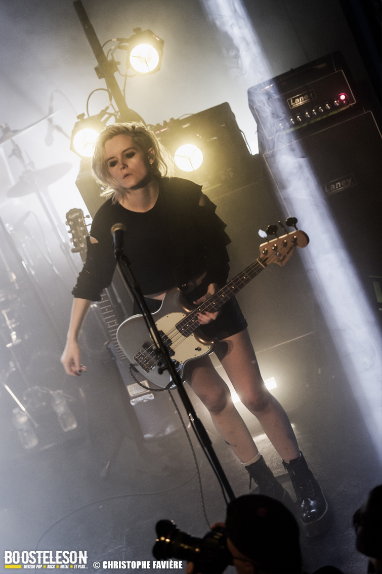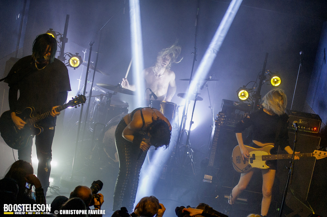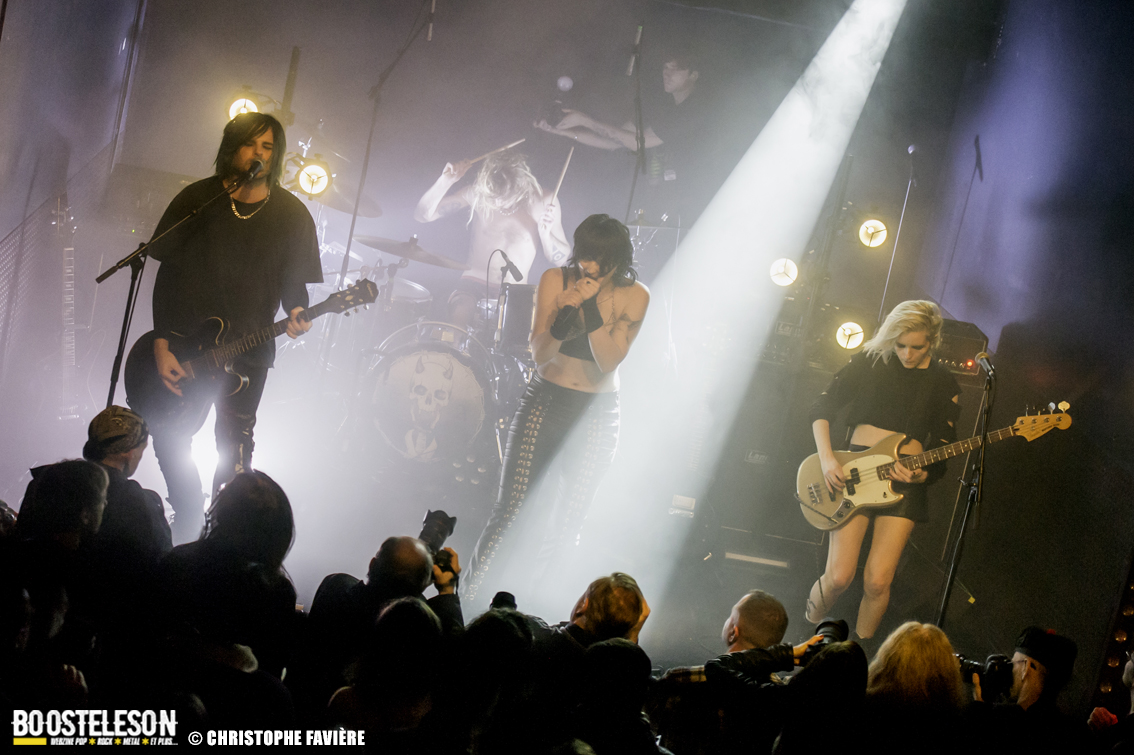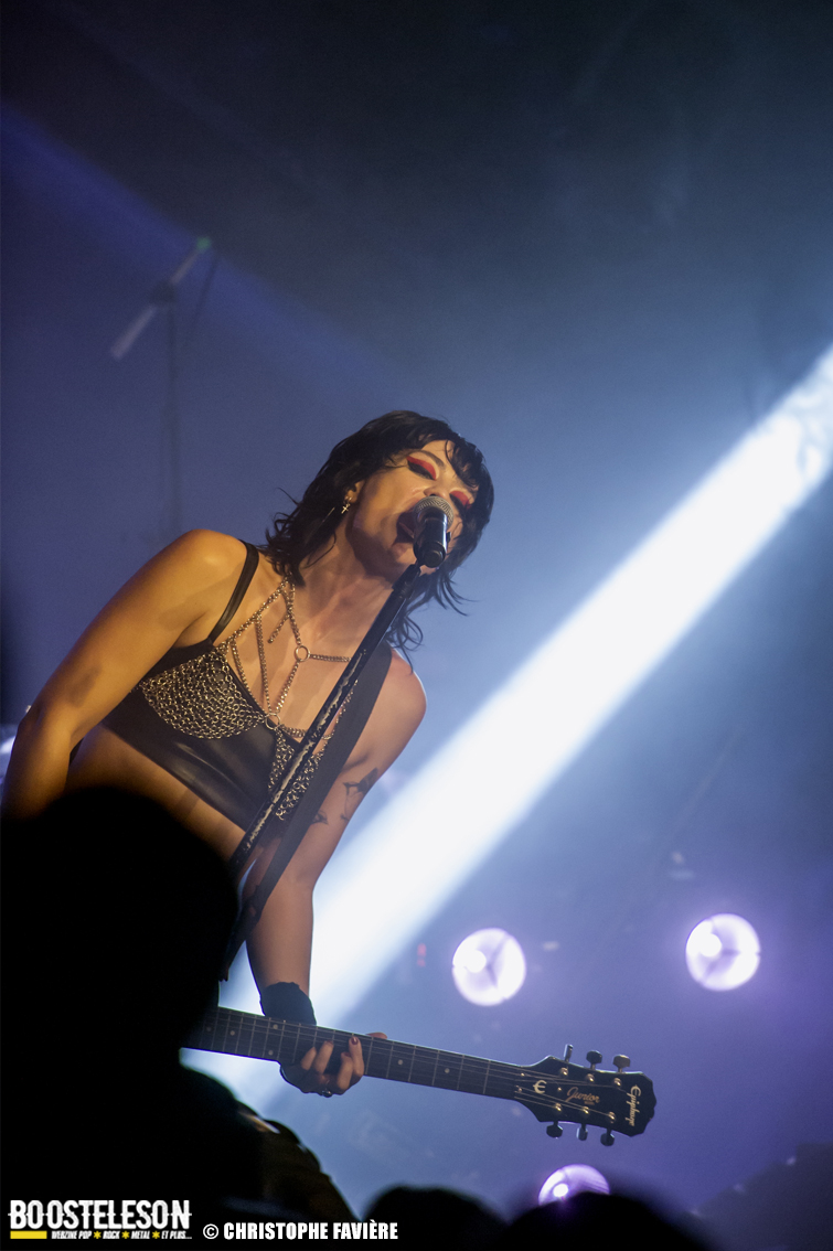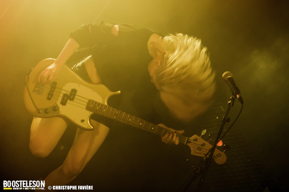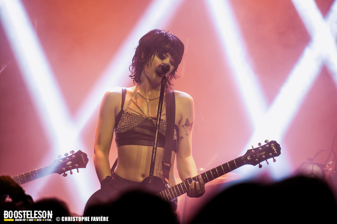 Originaire de l’est londonien, Saint Agnes était venu passer une journée promo au Dr Feelgood l’automne dernier. Groupe aux influences musicales plutôt variées, allant de Nine Inch Nails à Ho99o9, The White Stripes, Grinderman, White Zombie en passant par PJ Harvey, la chanteuse Kitty A. Austen vient sur scène exorciser ses démons. Accompagnée de Jon James Tufnell (chant, guitare), d’Andy Head (batterie) et de Maxine Cahill bassiste pour la tournée, le quatuor fait preuve d’une belle énergie. Que ce soit la jolie bassiste, en short, sautillant et agitant son médiator à vitesse grand V, le guitariste assénant des riffs violents à la Nine Inch Nail ou Rage Against The Machine, ou encore le batteur produisant une frappe monumentale à la manière d’un Dave Grohl, on ressent à chaque instants toute la vitalité du combo. Sur « Mean Nothing To You », Kitty se mettre définitivement le public dans la poche en organisant sur le break un Wall Of Death que l’assistance exécutera avec plaisir. Avec une setlist de quelques titres tirés de leur dernier album « Bloodsuckers », Kitty, à l’attitude punk, anime à merveille la scène des Etoiles. Dans chaque morceau, les paroles ont un lien avec un événement comme celui du décès de la mère de Kitty dans l’émotionnel « This Is not The End ». Sa plus grande énergie vient d’ailleurs de son fort intérieur, de ses émotions. Autrement dit, jouer devant le public lui procure beaucoup d’énergie ! A tel point qu’elle finira par plonger et surfer dans la fosse parisienne qui l’accueille bien volontiers. Avec un show de seulement cinquante minutes, Saint Agnes parvient à conquérir l’audience des Etoiles : les pogoteurs s’en donnent à cœur joie.