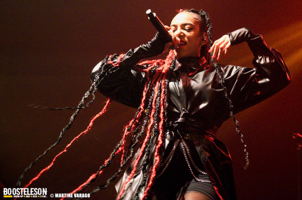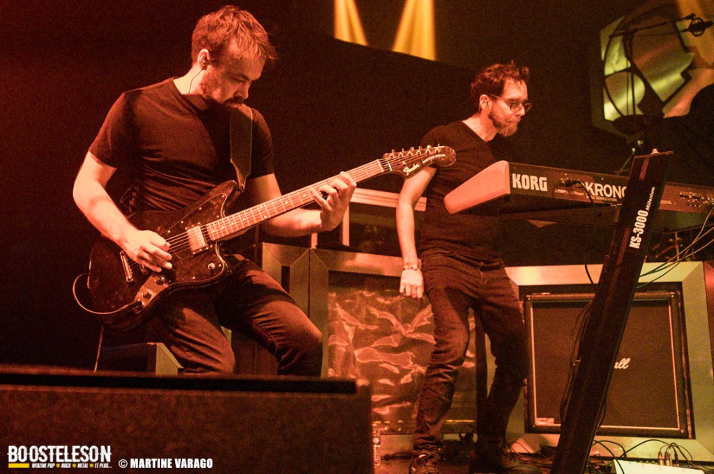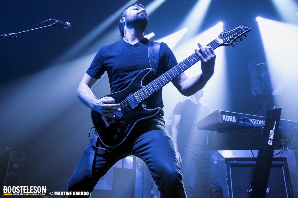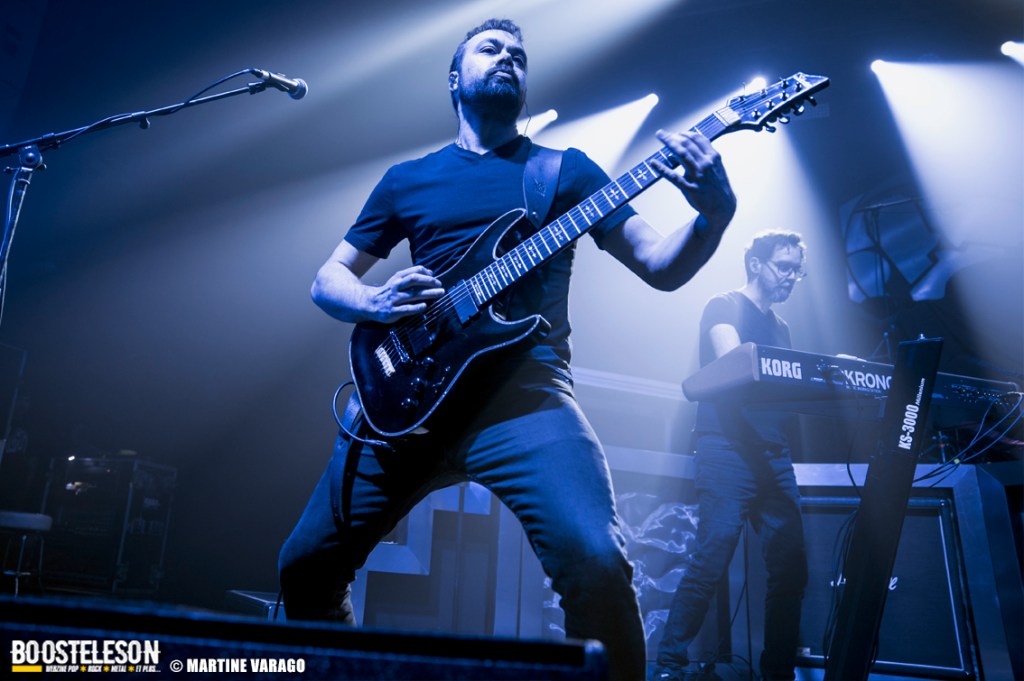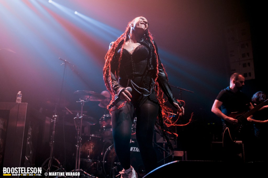 Situé le long de la Seine, le 106 est une salle très agréable avec sa longue baie vitrée et ses salles de concert. No Terror in The Bang, groupe de metal progressif assure la première partie et démarre une intro à la batterie qui annonce un univers clair-obscur, entre fragilité et fureur. D’ailleurs, le nom du groupe fait référence à une phrase d’Alfred Hitchcock, évoquant le calme avant la tempête et la tension de ses films : « There is no terror in the bang ». Menée par la chanteuse Sofia Bortoluzzi, à la voix mezzo, elle alterne les personnages, les chants clairs et saturés. Sa prestation ne se limite pas qu’au chant puisqu’elle danse, tournoie et virevolte avec ses longues mèches rouges, ce qui lui offre une belle place sur les planches. A la direction artistique, le batteur-compositeur Alexis Damien ainsi qu’Etienne Cochin (guitare), Clément Bernard (guitare), Brice Bouchard (basse) et Romain Greffe (claviers) créent une musique à l’atmosphère unique et narrative, entre metal moderne et B.O de films sombres, avec suspens et climax. Les morceaux du groupe alternent entre rêves et cauchemars et le public apprécie.