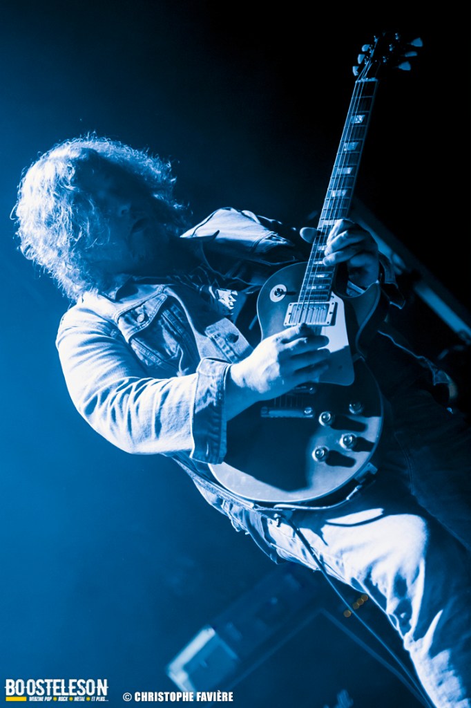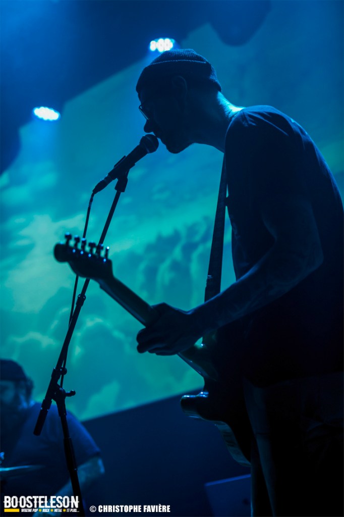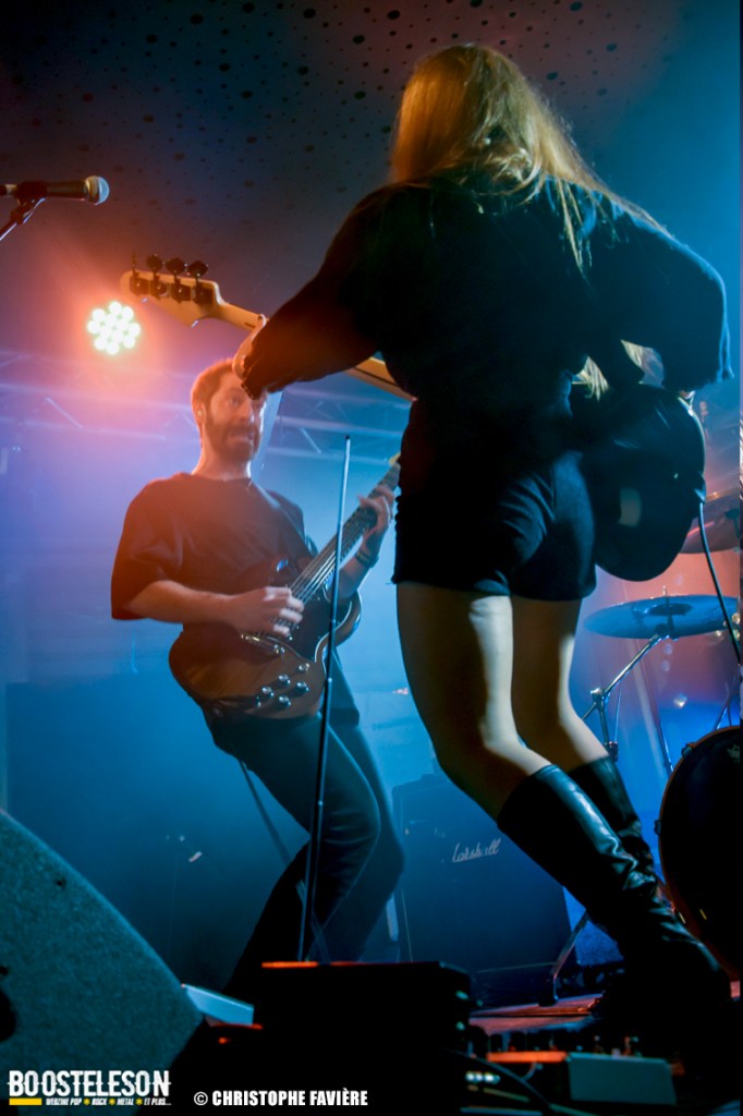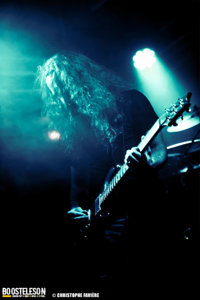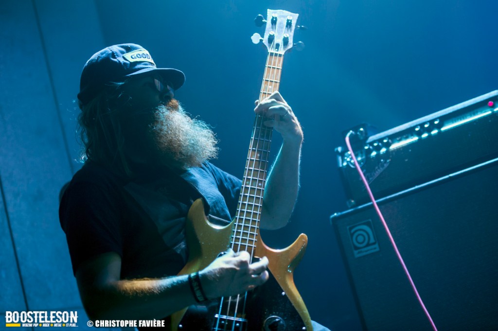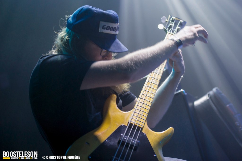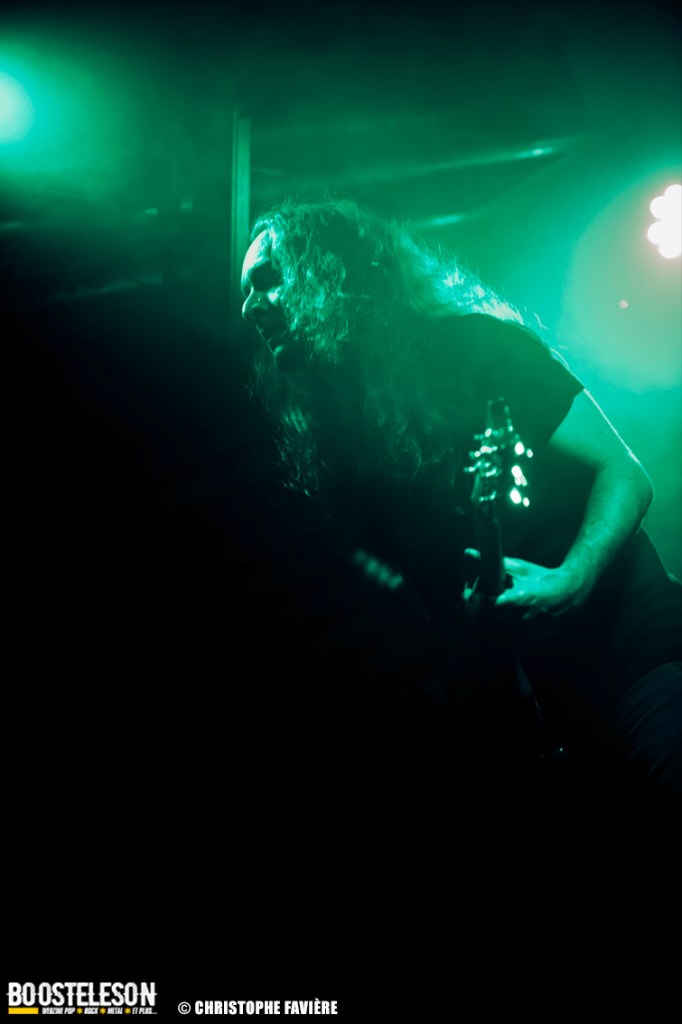 Là encore, ce samedi avait bien commencé avec ONE SHOT. Formé pratiquement uniquement d’anciens membres du groupe Magma, le groupe nous fait voyager dans son univers entre Jazz expérimental, Psychedelic et Progressive Rock. De quoi remettre gentiment la machine en route en ce samedi. On se précipite alors au Club pour retrouver Witchorious qui nous avait tant impressionné lors de leur passage en première partie de Knuckle Head quinze jours plus tôt à la Maroquinerie (Live report ici ->). Et le trio n’a fait que confirmé tout le bien que l’on avait pensé d’eux. Gros riffs à la Black Sabbath, section rythmique impressionnant, univers sombre, nous ne serions pas étonnés de voir ce groupe gravir rapidement les échelons tant leur prestation et leur cohésion sont impressionnantes. Retour dans la grande salle pour Cloakroom. Difficile de définir la musique du groupe originaire de l’Indiana. Mélange de Space Rock, de Stoner, de Doom ou encore de Shoegaze, le combo nous invite dans un univers tantôt lourd, tantôt atmosphérique, étonnant, mais appréciable. A ce moment de la soirée, les choses commencent à se gâter. Suite probablement aux pluies de la semaine, une remontée d’égouts commence à exercer une certaine influence sur l’air ambiant et une odeur nauséabonde (on vous laisse imaginer laquelle) commence à envahir la grande salle. Bonne excuse pour filer une dernière fois au Club pour retrouver Maudits (désolé pour les photos, un problème de carte mémoire). Le trio alterne entre Doom et Ambiant, créant une ambiance oppressante et répétitive grâce à une maitrise impressionnante des loops par le guitariste (pédale d’effet permettant d’enregistrer en direct un riff ou une mélodie et de la répéter à l’infini). Du fait de son côté instrumental et la richesse de ses compos, le groupe est difficilement identifiable à un genre. Là encore, une belle découverte. 22.30, l’heure de retourner dans la grande salle pour le dernier concert du week-end, et malgré la réactivité de l’équipe de l’Empreinte et la venue des services adéquats, les choses ne se sont pas arrangées. Les regards censés évacuer l’eau lors du nettoyage refoulent en plein milieu de la salle tout ce qui est supposé en sortir. Qu’à cela ne tienne, le public fait contre fortune bon cœur et reste en masse pour assister au concert de monkey3. Et les Suisses les en remercient en nous offrant un show de toute beauté, tant sonore que visuel. Avec leur musique à la croisée du Stoner et du Psychedelic Rock, les Helvètes nous gratifient d’un voyage hors du temps et de l’espace, renforcé par les images diffusées sur l’écran géant en fond de scène. Une bien belle manière de conclure cette soirée et cette deuxième édition qui aura vu un public venir en masse malgré le RER en travaux, et malgré les problèmes de tuyauterie. Espérons que cette fidélité sera récompensée par une troisième édition en 2025. Cette musique le mérite amplement. Noblesse oblige !