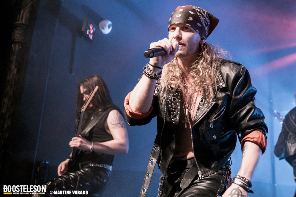 Dans la pénombre, on distingue seulement les instruments sur « Am I Evil » de Diamond Head. Soudain, le quintet tant attendu de Wings Of Steel apparaît et la voix de Leo Unnermark et les riffs de Parker Halub déchirent. Le ton est donné. C’est leur premier concert Parisien et Leo est enthousiasmé de rencontrer son public frenchy. Démarrage bien Heavy Metal avec « Fall In Line » puis « Cry Of The Damned » pour laisser place à d’envoûtantes mélodies sur « Leather And Lace ».