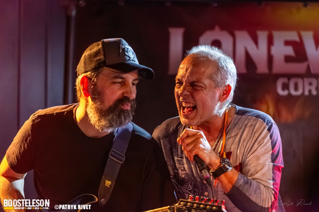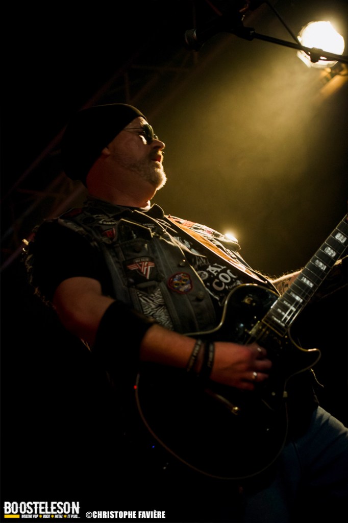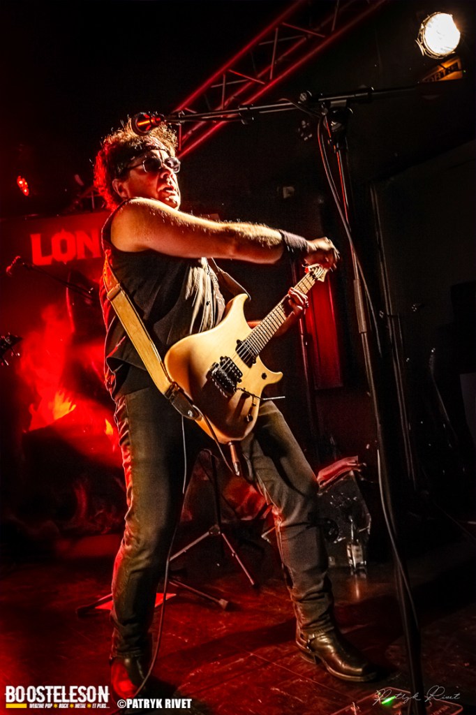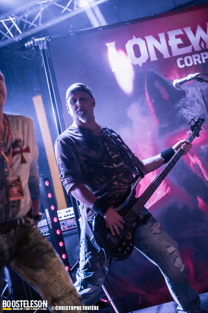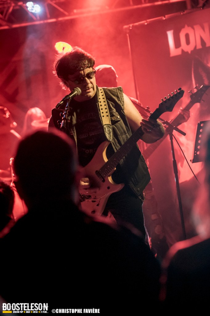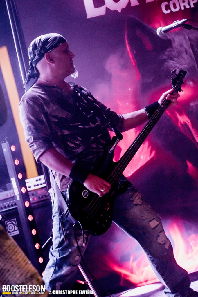 Les Essonniens de Lonewolf Corp. démarrent la cuisson directement à feu vif avec leur heavy metal inspiré par les groupes de la New Wave Of British Heavy Metal mais pas que… Pas besoin de souffler sur les braises pour faire monter la température avec leur set débutant pied au plancher sur « Fight » (tiré de l’album Choose Your Hell) et son riff que Lemmy de Motorhead n’aurait pas renié. Le quintet se présente ici avec la dernière mouture du line Up avec Stéphane Rospars (basse) et Jérôme Piat (ex Still Square, combo dans lequel officiait également Fabrice Trovato batteur de Charcoal) les deux nouveaux venus. Le groupe enchaine les titres à la vitesse d’un V8 lancé sur l’autoroute de l’enfer (« V8 on the Highway » – album Seven), Jérôme et Julien enchaînent solos et riffs heavy, s’en donnant à cœur joie sur « California » (album Death Is My Enemy) pendant que Toff martèle les fûts. En bon frontman Luc fait le show au micro et met le public directement dans l’ambiance d’autant plus que le son est excellent. On notera que le groupe a récemment sorti l’album « Heavy Metal Anniversary » où ils ont réenregistré 16 titres piochés dans les 8 albums précédents et seront en concert le 29 Mars prochain à La Biscuiterie de Château Thierry avec Sleazy Town et Charcoal.