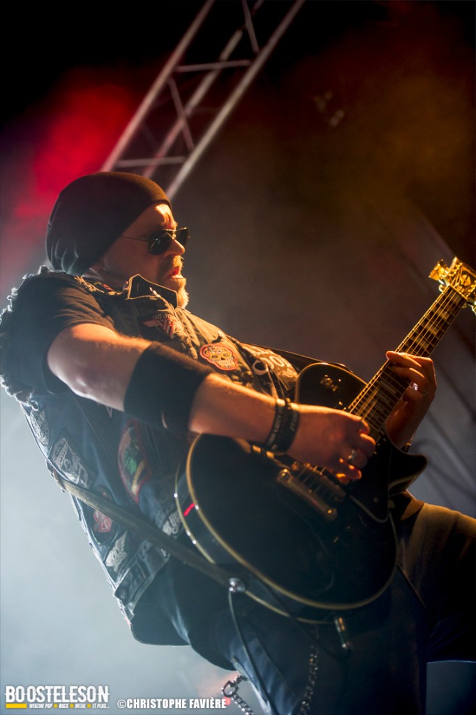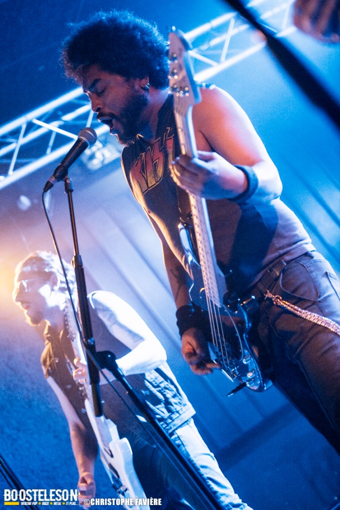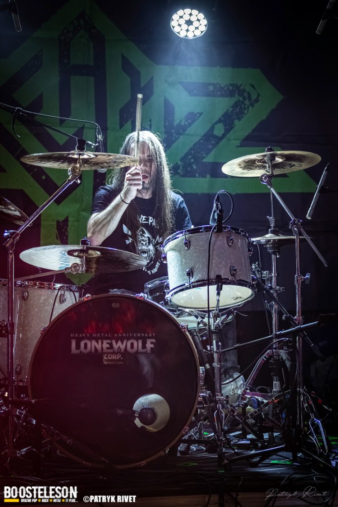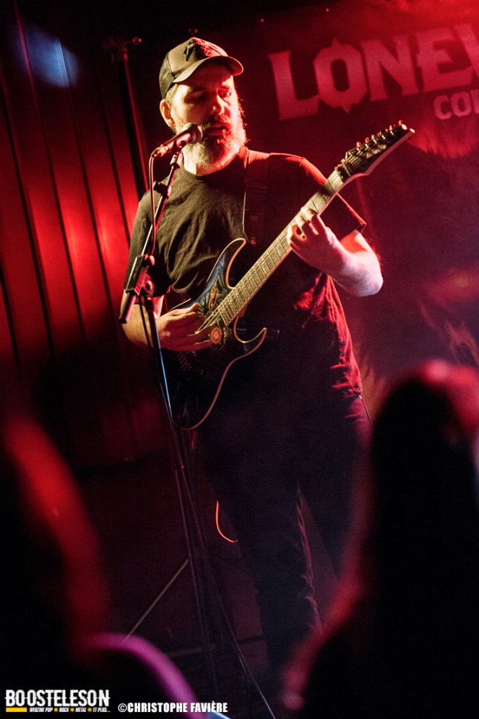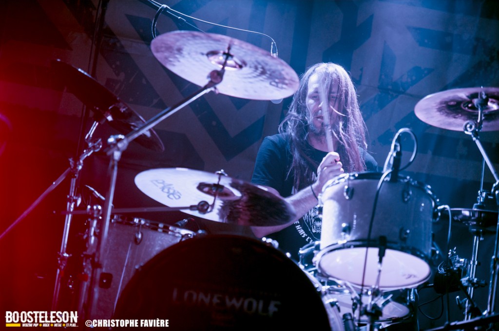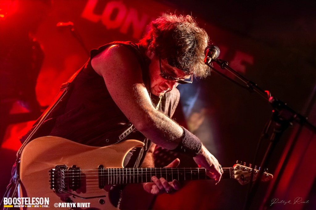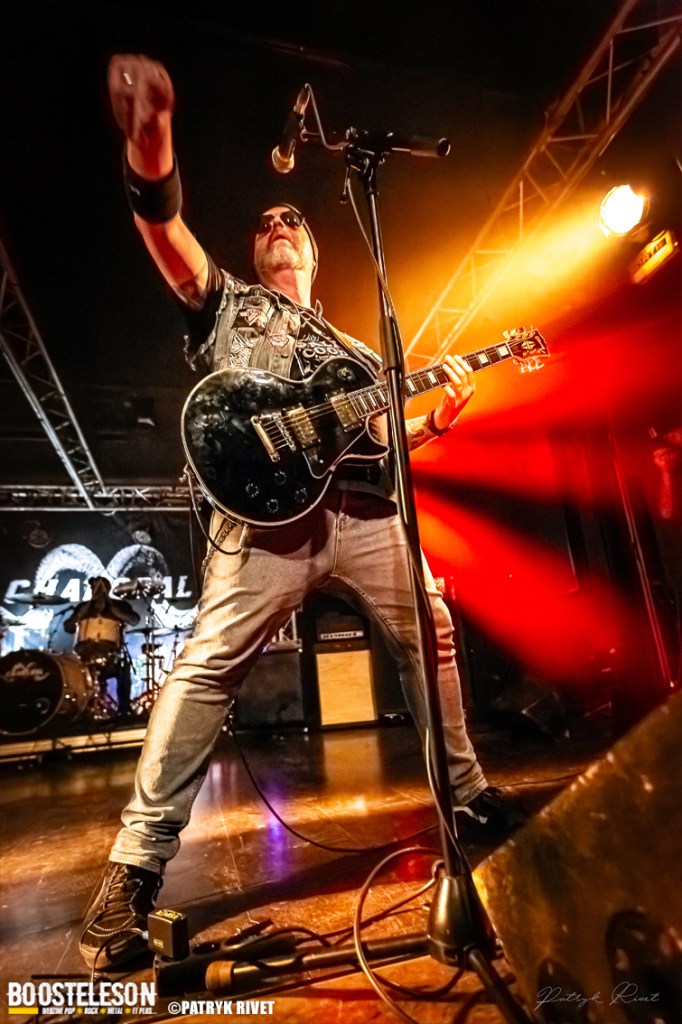 Les Essonniens de Lonewolf Corp. démarrent la cuisson directement à feu vif avec leur heavy metal inspiré par les groupes de la New Wave Of British Heavy Metal mais pas que… Pas besoin de souffler sur les braises pour faire monter la température avec leur set débutant pied au plancher sur « Fight » (tiré de l’album Choose Your Hell) et son riff que Lemmy de Motorhead n’aurait pas renié. Le quintet se présente ici avec la dernière mouture du line Up avec Stéphane Rospars (basse) et Jérôme Piat (ex Still Square, combo dans lequel officiait également Fabrice Trovato batteur de Charcoal) les deux nouveaux venus. Le groupe enchaine les titres à la vitesse d’un V8 lancé sur l’autoroute de l’enfer (« V8 on the Highway » – album Seven), Jérôme et Julien enchaînent solos et riffs heavy, s’en donnant à cœur joie sur « California » (album Death Is My Enemy) pendant que Toff martèle les fûts. En bon frontman Luc fait le show au micro et met le public directement dans l’ambiance d’autant plus que le son est excellent. On notera que le groupe a récemment sorti l’album « Heavy Metal Anniversary » où ils ont réenregistré 16 titres piochés dans les 8 albums précédents et seront en concert le 29 Mars prochain à La Biscuiterie de Château Thierry avec Sleazy Town et Charcoal.