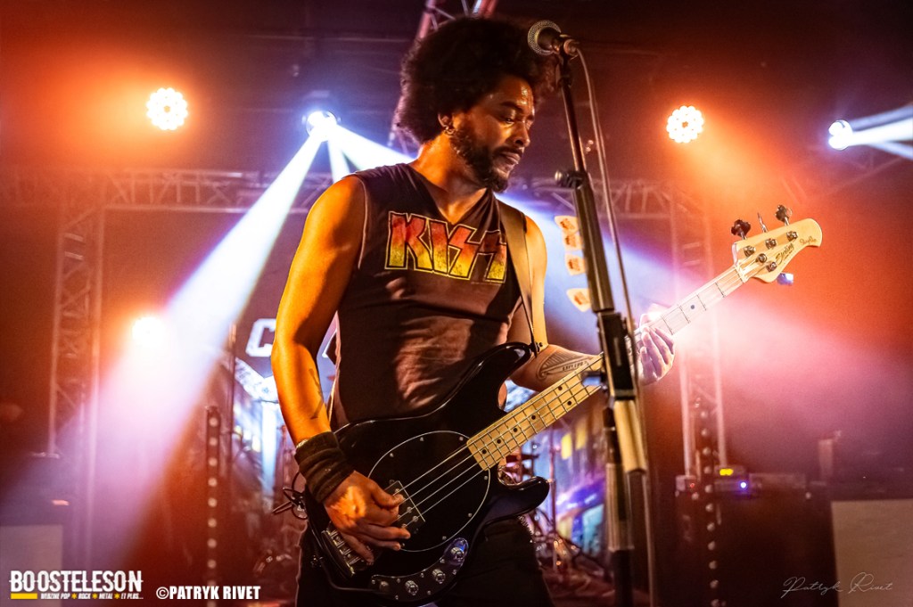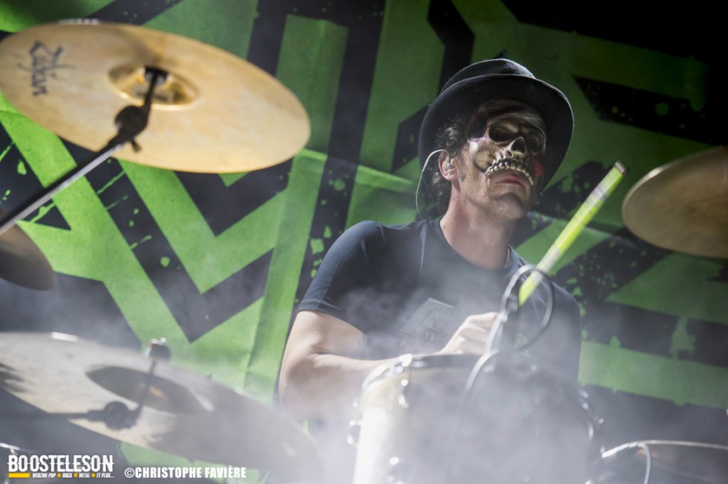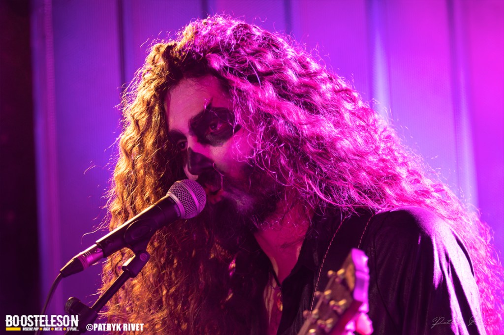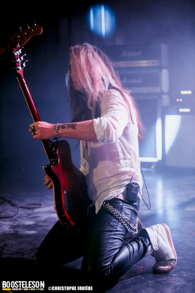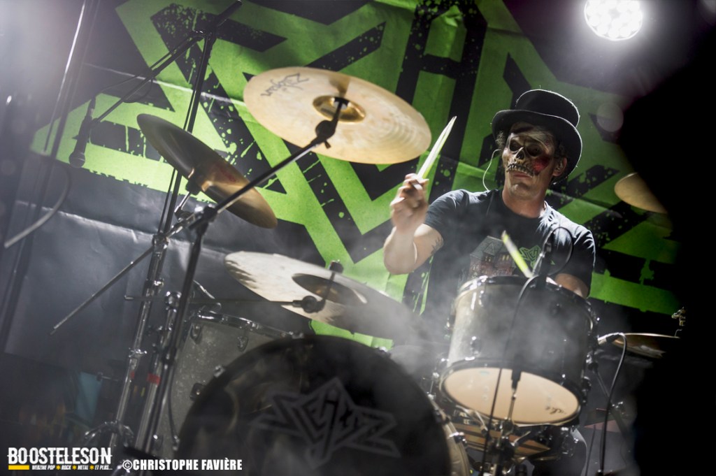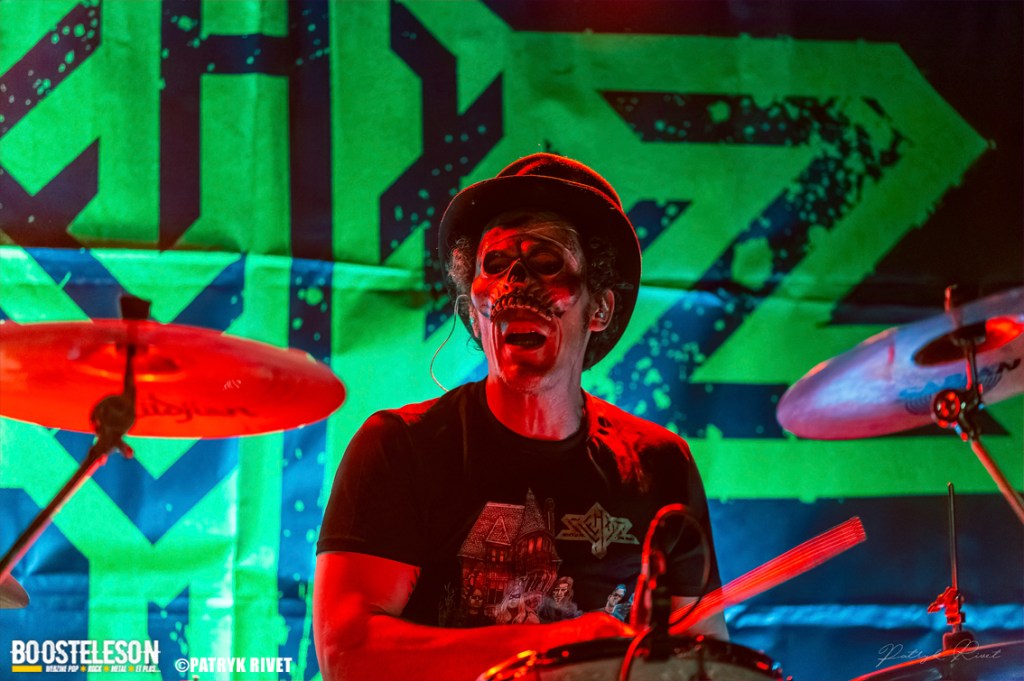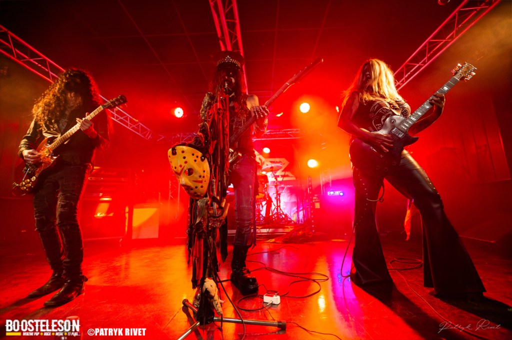 La soirée se poursuit avec une immersion dans les contes de la crypte, magnifiquement orchestrée par le quatuor freak de Sleazyz, maquillés et habillés avec un style qui ferait fuir instantanément la plus cool des belles-mères ! Sleazyz se définit comme du Horror Metal Sleaze et propose un mélange décadent de punk, de metal, de glam et de sleaze. Fred Deceased (basse et chant lead), Pandemonium (guitare) Thomas Healstone (guitare) et Raph El Rafale (batterie) sont les rejetons non reconnus d’Alice Cooper et de Rob Zombie ! Leur set démarre par « Psycho Witch » tiré de leur album March Of The Dead (2021), avant d’enchaîner par « Necromancer », titre aux accents hardcore issu de leur dernier album Glitter Ghoulz From Hell (2023), une chose est sûre ces troyens ne font pas dans la dentelle et c’est tant mieux. Leur set fait la part belle à Glitter Ghoulz From Hell et se termine sur « Life Will Never Be The Same » titre aux accents Ramones qui remporte l’adhésion du public.