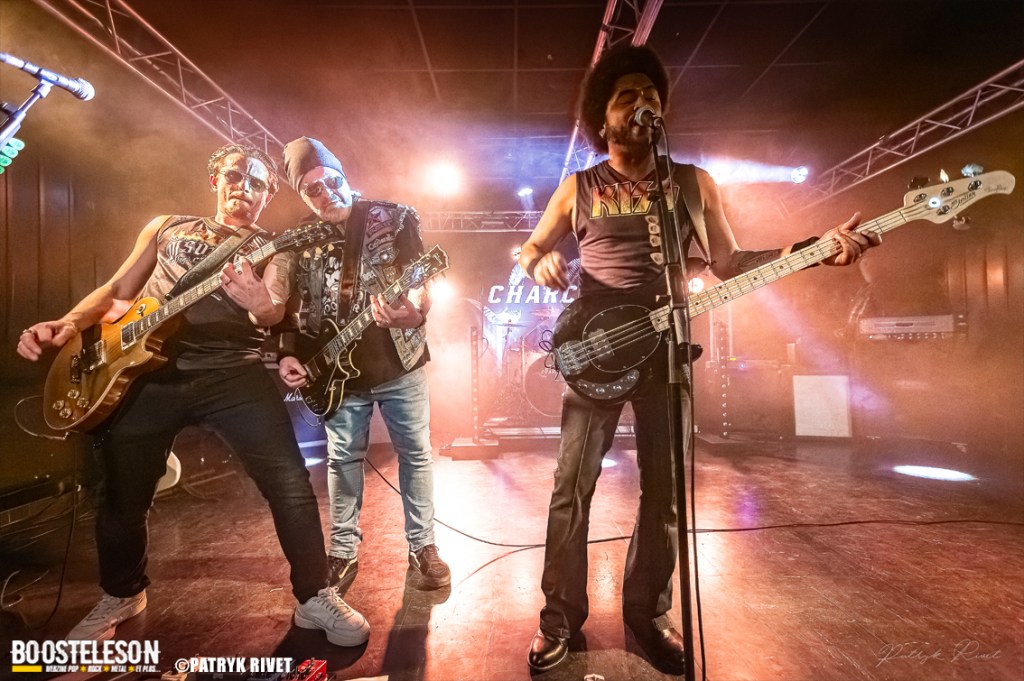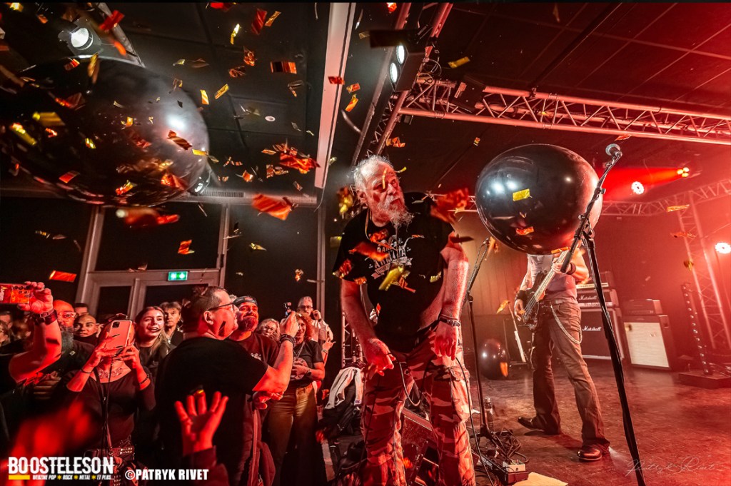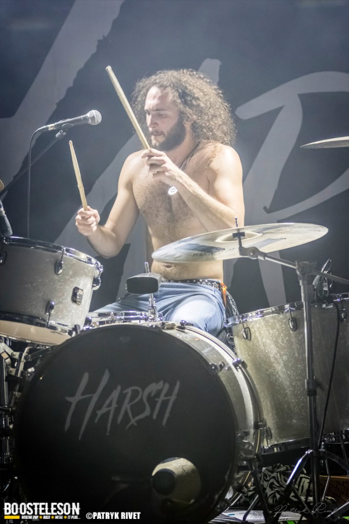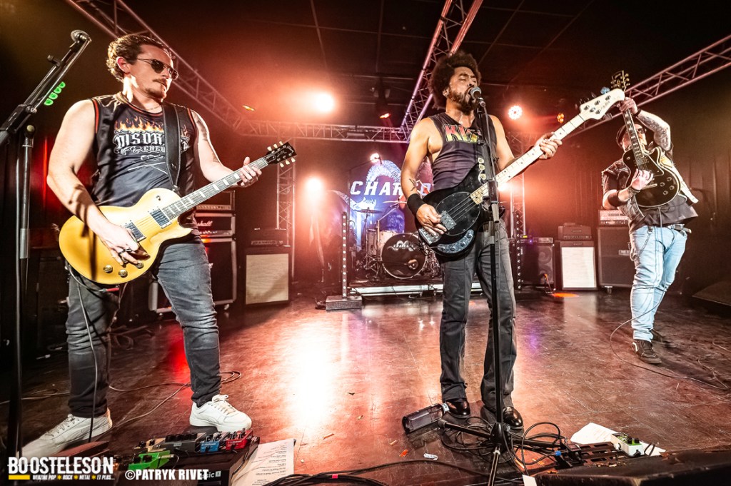 21H30 c’est l’heure pour nos maîtres de cérémonie de monter sur scène, sur la bande son d’une boîte à musique jouant un air de noël. Et surprise Charcoal nous envoient d’entrée de jeu « Merry Fuckin’ Rockin’ Xmas ! » leur tout nouveau single de noël censé sortir le 6 décembre accompagné d’un clip. Ce titre redoutablement efficace vous fera certainement penser au « We’re Not Gonna Take It » des Twisted Sister et on a vraiment hâte de découvrir le clip pour voir quelles nouvelles idées saugrenues ces quatre-là nous ont encore pondues ! Depuis leur premier concert en septembre 2023 lors de la Lodex Party à l’empreinte de Savigny le Temple le groupe a largement gagné en assurance sur scène (premières parties pour Locomuerte et Koritni, Fertois Metal Fest, Festival de Vouziers, Thin Lizzy Fest…). Passée la surprise de ce single de noël c’est « The Rocky Road To London » qui nous renvoie dans leur 1er Ep « Rocks » sorti au printemps et joué en quasi-totalité ce soir avec quelques nouveaux morceaux déjà entendus sur les précédentes dates comme le très bon et potentiel single « Hey Doc, Addict Or Not ». Évidemment, les Charcoal ne pouvaient pas quitter la scène sans jouer « One Night Of Rock ‘N’ Roll » interprété en guise de rappel avec lâché de ballons et orgie de confettis, un titre qui colle bien avec l’esprit de cette soirée puisque tous les groupes se sont rendus disponibles dans le hall autour d’un verre ou aux stands de merchandising pour échanger quelques mots et recevoir les impressions du public. Le succès de cette soirée est indéniable si on en juge la pénurie de bière au bar juste avant le set des Parisiens de Harsh.