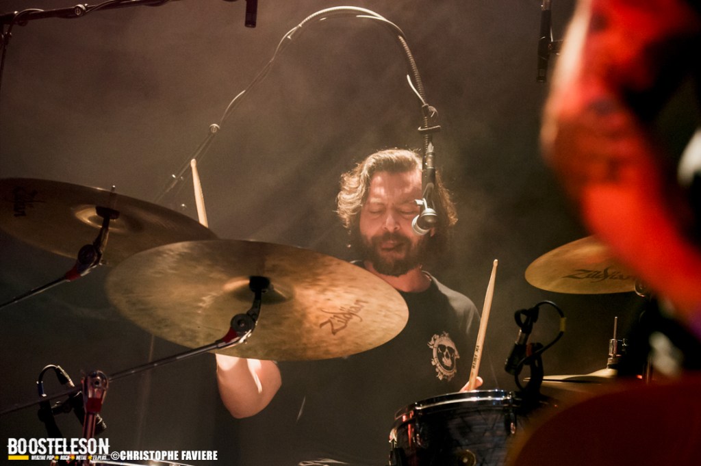 La soirée commence avec la performance explosive du groupe Hongrois Lazarvs. Dès les premières notes, il est clair que ce groupe maîtrise parfaitement l’art de plomber l’ambiance, mêlant des influences allant du Doom, au Thrash en passant par le Death Metal. Les lights minimalistes et rouges (les photographes apprécieront !) ajoutent une intensité palpable à l’atmosphère déjà lourde. Le guitariste/ chanteur András Áron, arborant un t-shirt Cannibal Corpse, captive l’assistance avec sa voix puissante révélant une palette de gamme impressionnante allant de Phil Anselmo (Pantera) au regretté Layne Staley (Alice In Chains). La section rythmique composée de Attila Balogh à la basse et Laszlo Makai à la batterie propulse un son lourd et groovy à la fois. Les transitions maîtrisées entre tempos lents et passages rapides gardent l’énergie du concert à son maximum, et ravissent les nombreux fans du trio présents ce soir. Les titres s’enchaînent sans temps morts. Les influences de groupes comme Pantera et Sepultura sont évidentes, mais Lazarvs parvient à insuffler une touche unique à leur musique, avec d’autres influences plus subtiles comme Alice In Chains. L’interaction entre le groupe et l’audience est incroyable. Au fur et à mesure que le concert progresse, l’énergie ne faiblit pas. Un grand merci à Lazarvs pour cette performance captivante qui a su transporter le public dans un voyage sonore intense !