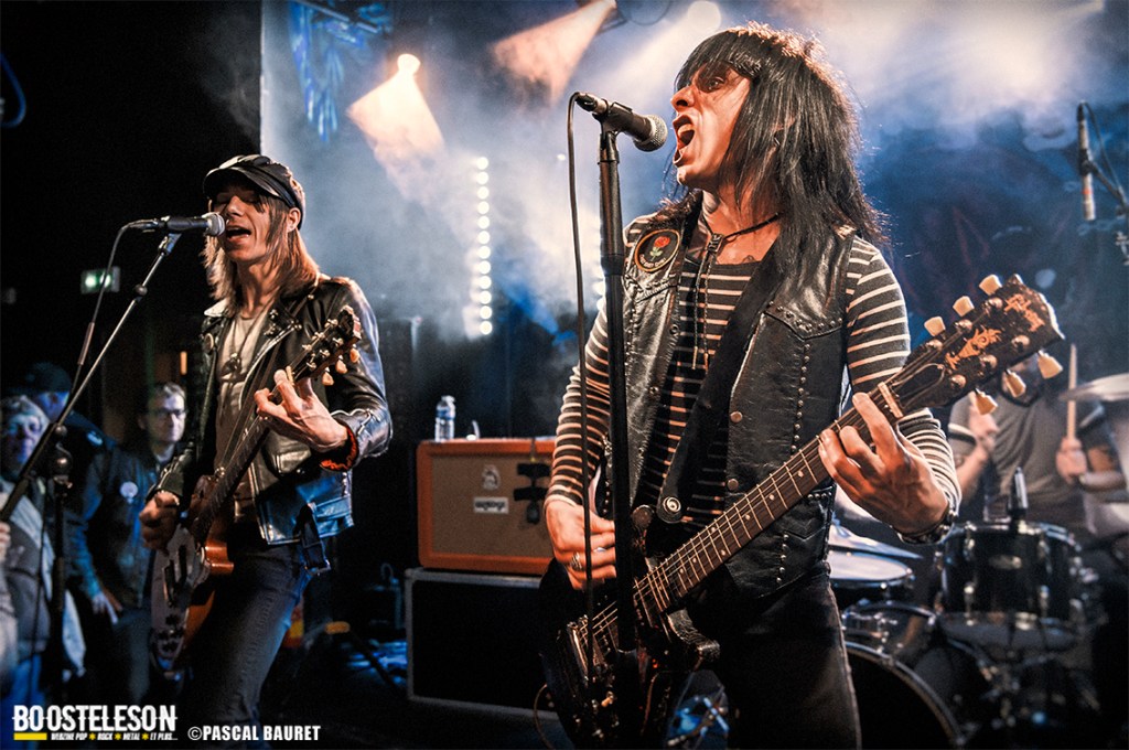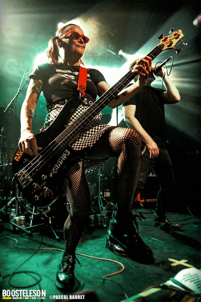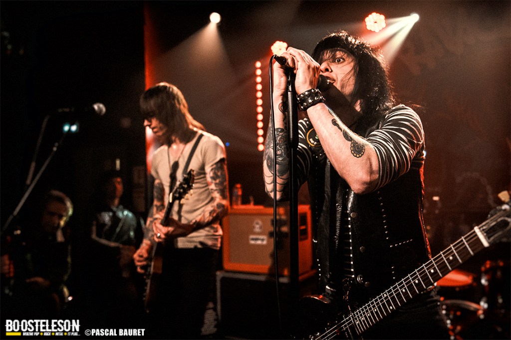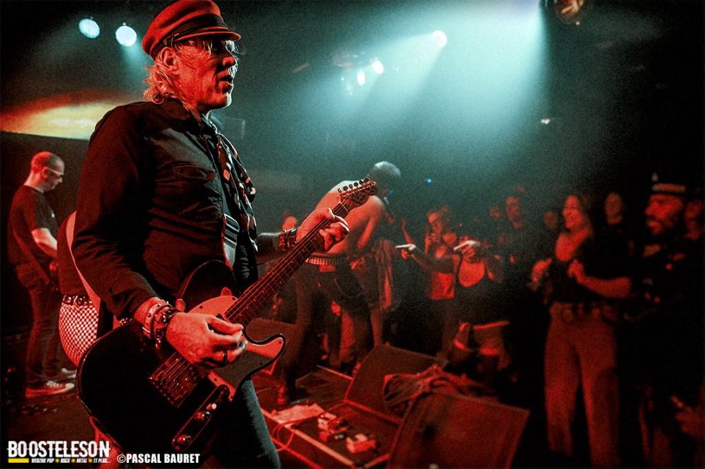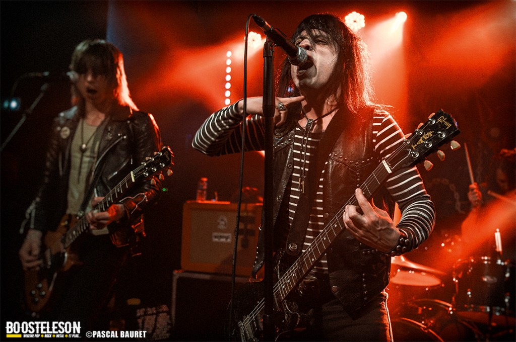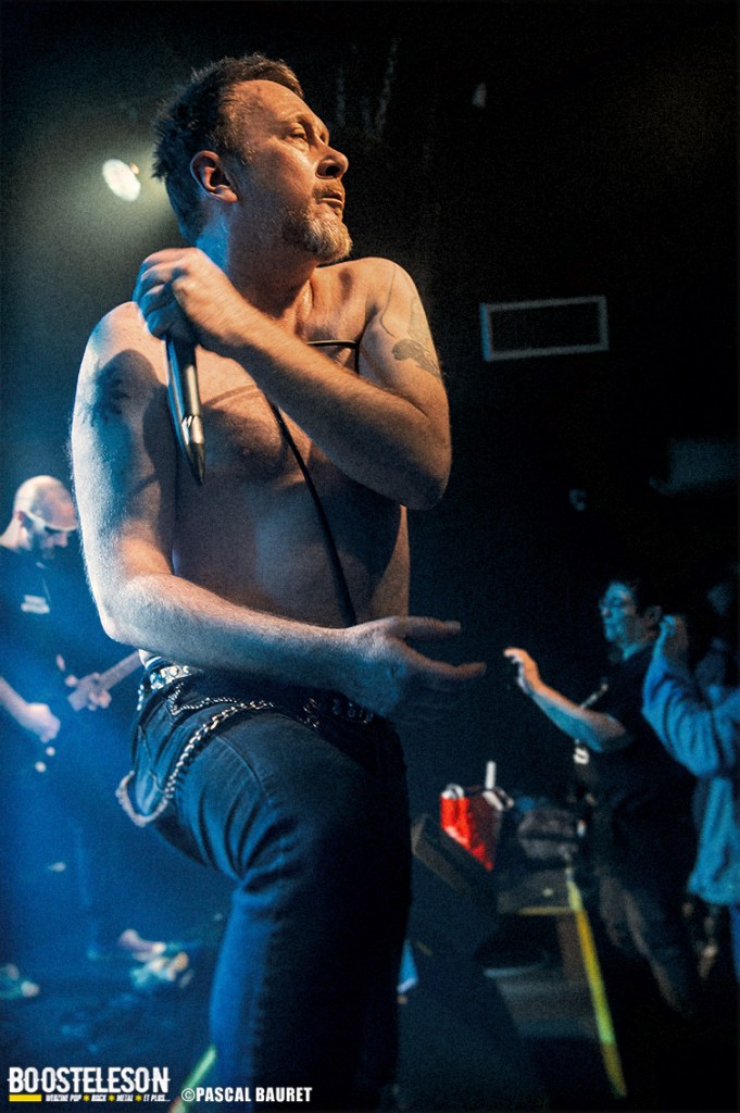 Les premiers à monter sur scène furent les Lipstick Vibrators. Le concert commence sobrement dans le noir, les musiciens s’installant avant de lancer leurs morceaux, entrecoupés de commentaires et d’anecdotes par le chanteur. Les fans de la première heure étaient là, dansant devant la scène. La salle, bien que légèrement clairsemée, permettait aux photographes de circuler facilement devant la scène pour trouver les bons cadrages. Les musiciens allaient à l’essentiel, et le chanteur faisait le show en jouant avec le micro, et terminant torse nu sous l’effet de la chaleur.