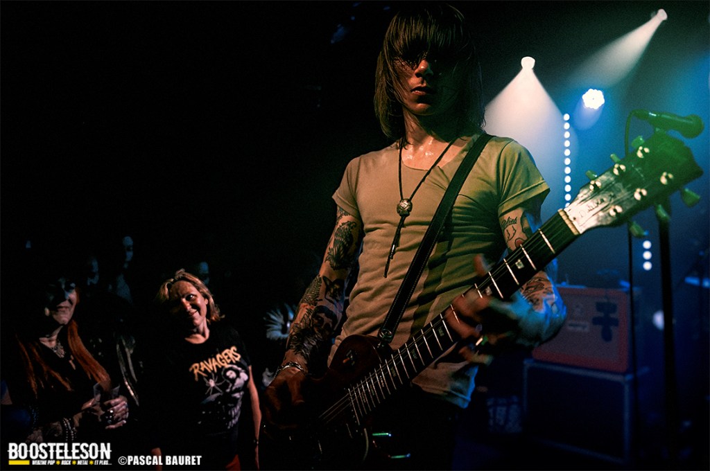 Puis ce fut au tour des Ravagers. La salle s’est rapidement remplie, et il était difficile de bouger, collé contre la scène. Le guitariste, casquette sur la tête, restait modéré dans son jeu, contrairement au reste de la bande qui montait en énergie et prenait la pose. Le public, acquis à leur cause, mettait l’ambiance. Le chanteur assurait le spectacle, jouant avec sa guitare, le pied de micro, et descendant dans le public. Avec la taille de la salle et l’énergie du public et du groupe, la température est rapidement devenue étouffante. Après la fin du set, le public en redemandait, et les Ravagers sont revenus pour un rappel avec deux morceaux supplémentaires.